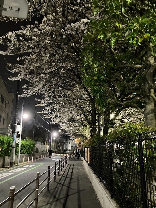 夜桜がきれい。 お花見もそろそろおしまいかな。 浦安小学校(浦安市猫実4-9-1)付近にて。