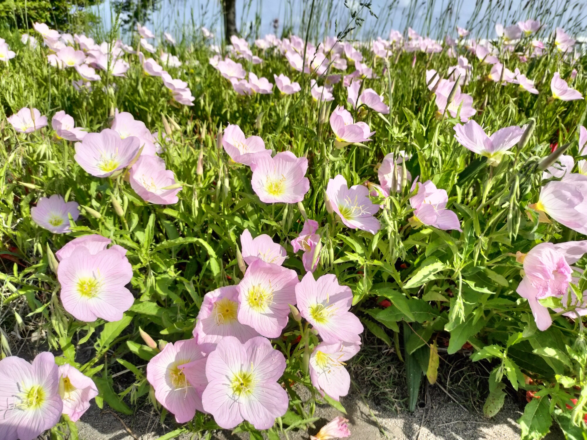 ポニーたちがパカパカとゆっくり歩く馬場の横には花畑があり、赤いポピーの花が風に揺れていました。この花畑は秋にはコスモスが咲くようです。青空の下、シンボリックな大木の緑が美しく、足元にはヒルザキツキミソウのピンクの花も愛らしく咲いています。空にはツバメがついと飛び交って、初夏らしくいい心地。