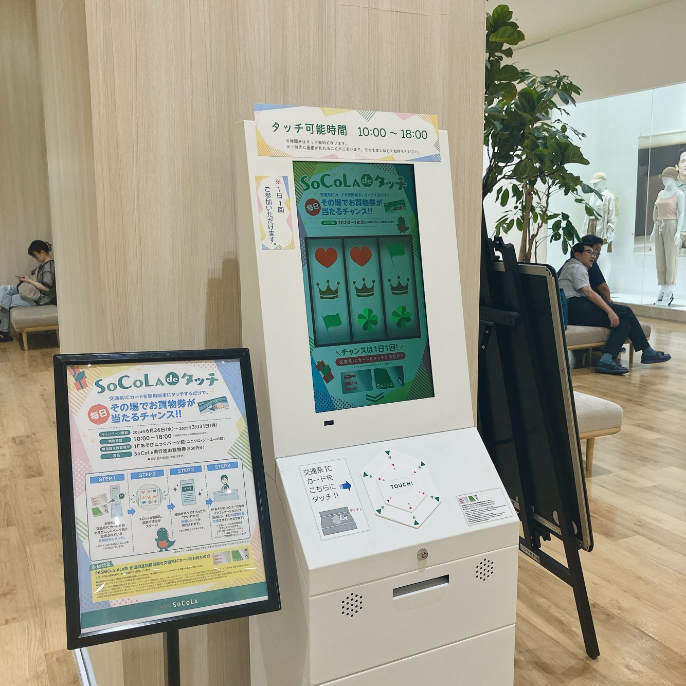 あそびにっくパークのすぐ目の前では、交通系ICカードをタッチするだけで、ソコラ南行徳のお買い物券が当たる抽選に、なんと毎日チャレンジすることができます!