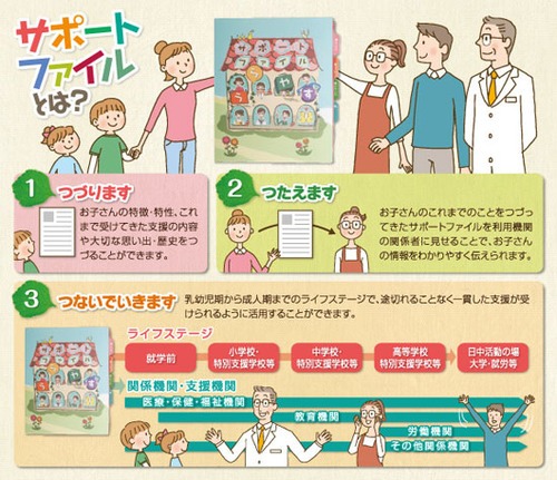 特別な支援や配慮が必要な子どもが、乳幼児~成人期までのライフステージで途切れることなく一貫した支援を受けられることを目的とした、保護者と保育園・幼稚園・学校等が子どもの情報を共有するためのファイル。