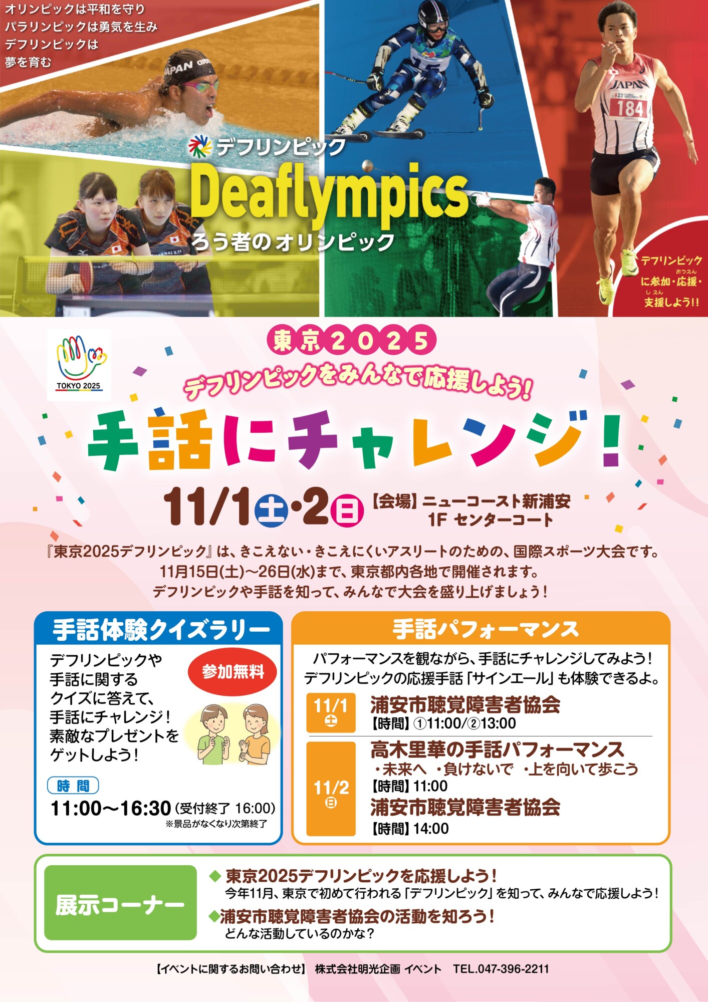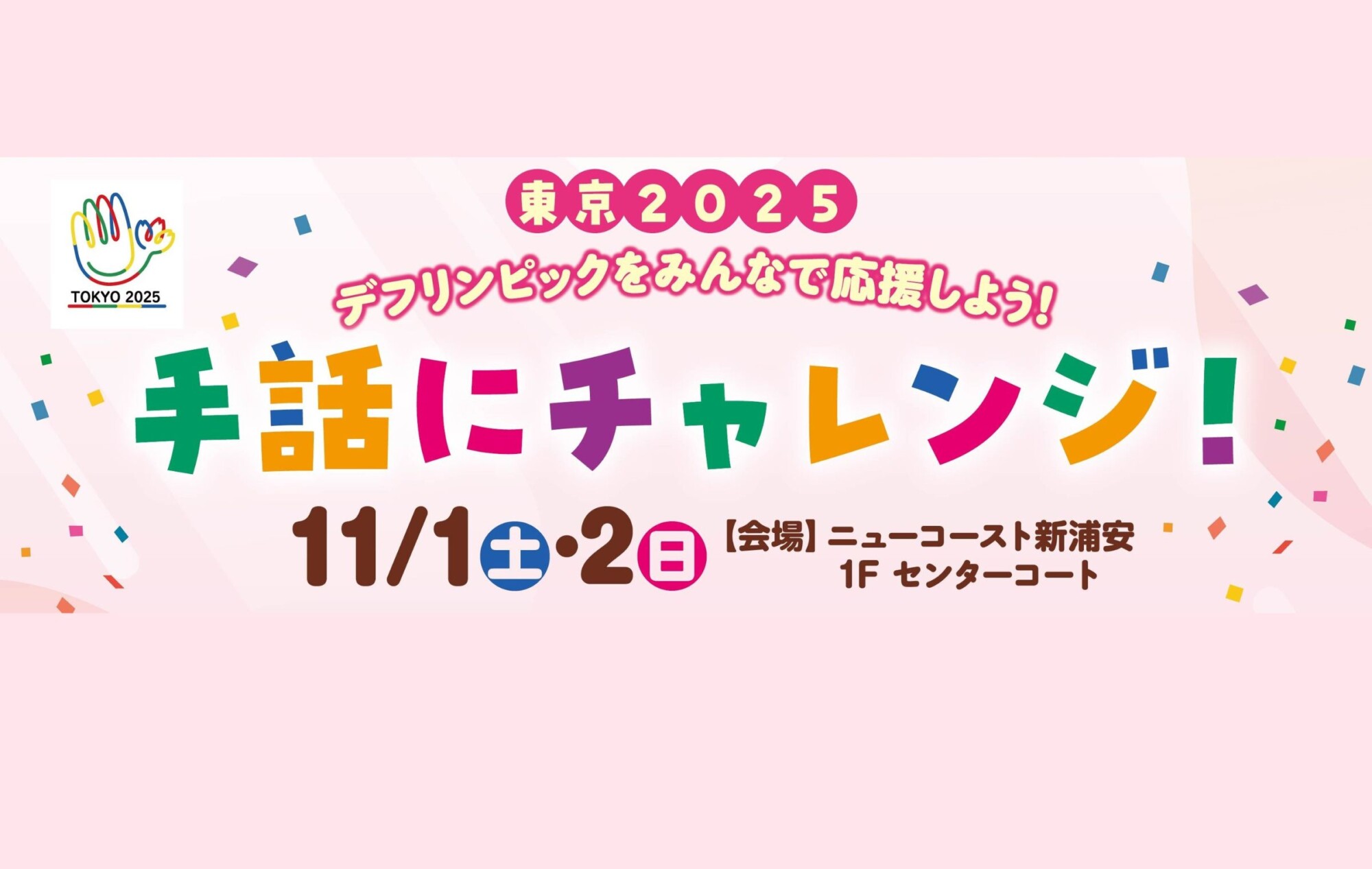 11月1日(土)・2日(日)、新浦安の「ニューコースト新浦安」で「デフリンピックをみんなで応援しよう!手話にチャレンジ!」が開催されます。