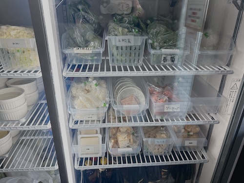 具材は冷蔵庫から自由に選べ、野菜コーナー(1つ110円)とお肉・練り物コーナー(価格別)が分かれていて清潔感も◎。