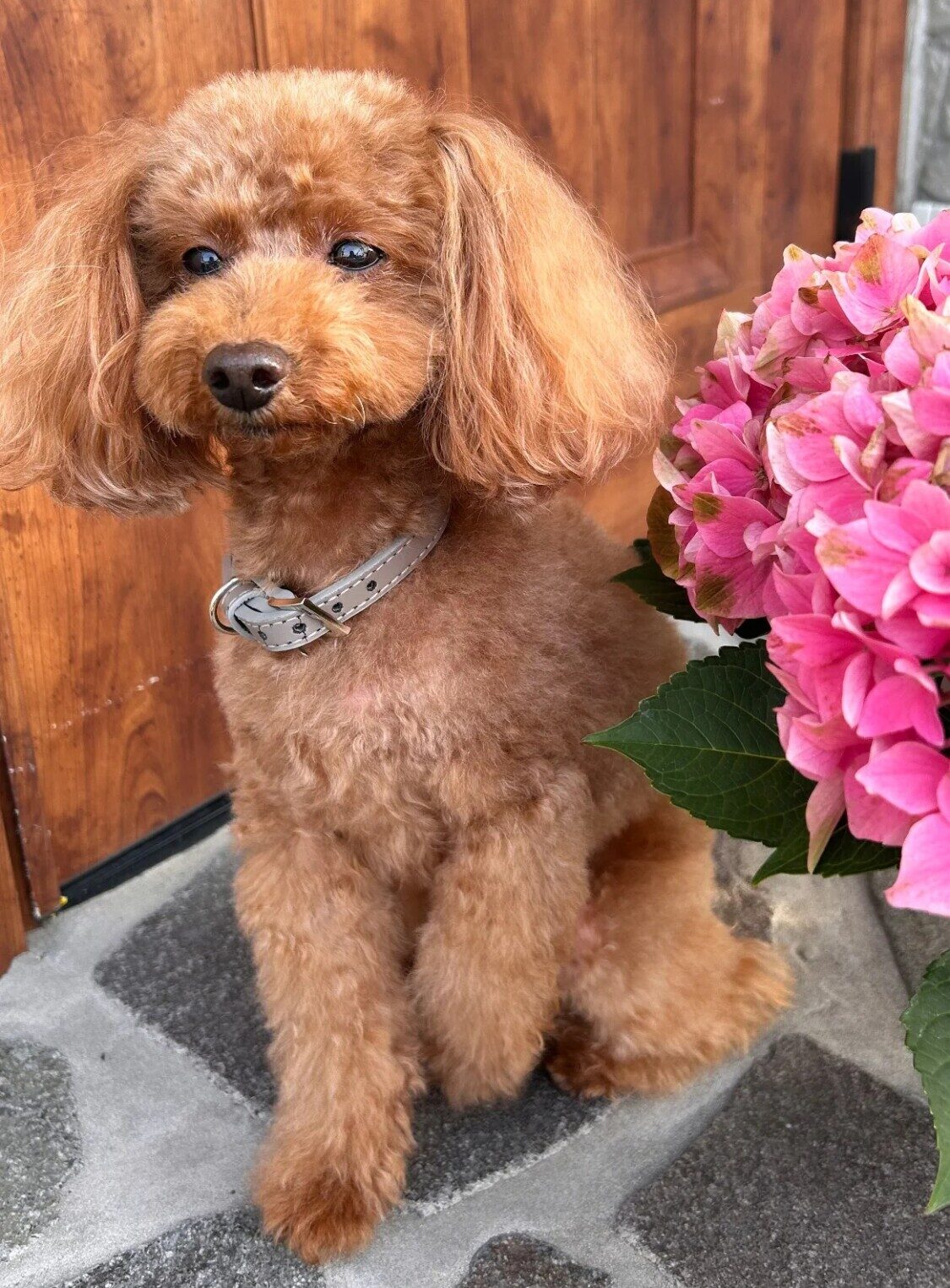 目がくりっとかわいくて、ついついおやつをあげちゃうママです。いつも娘と一緒に眠って、朝は目覚まし代わりに吠えて起こしてくれます。大好きな紫陽花と一緒に!