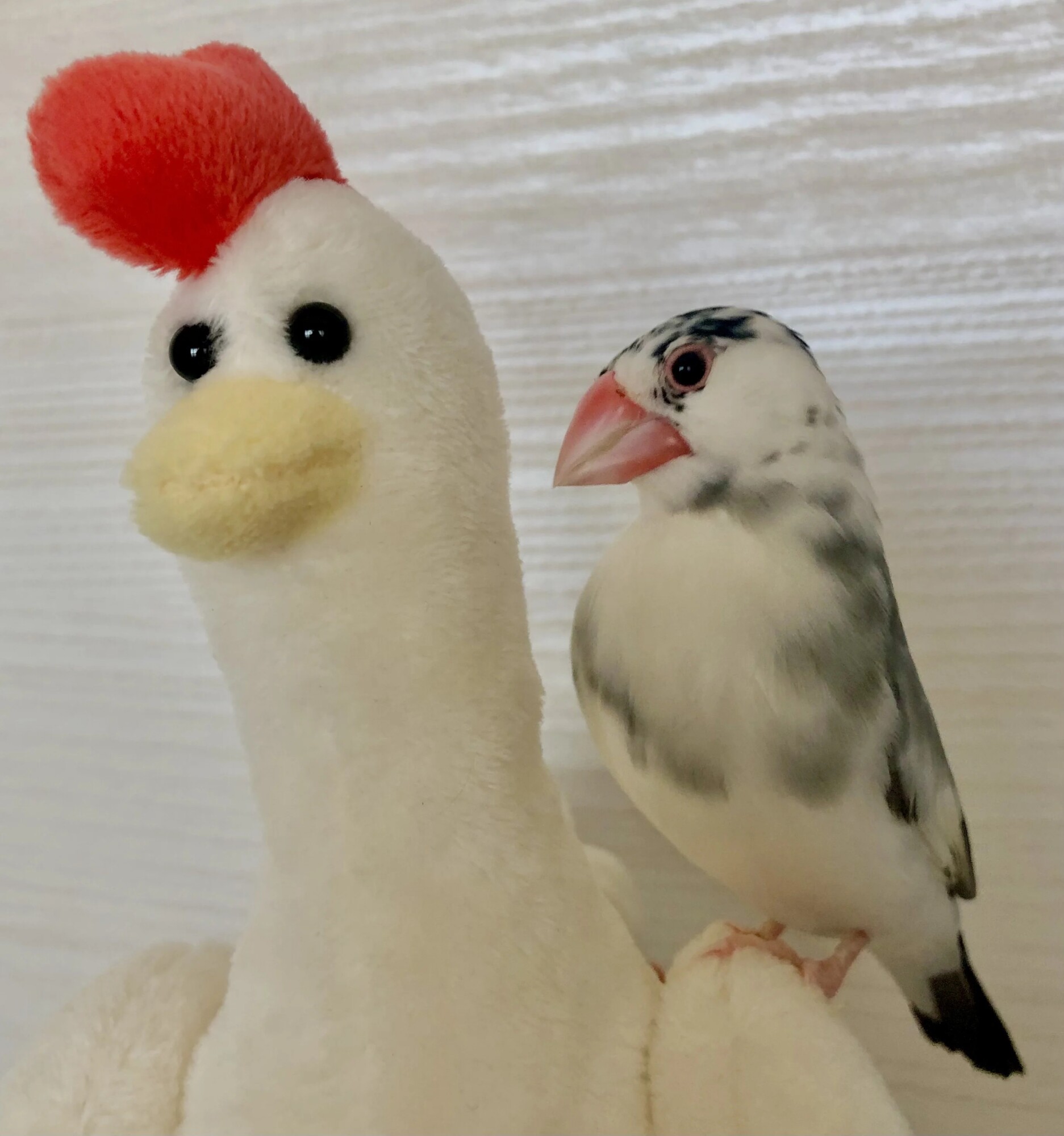 人が帰ると呼び鳴きで迎えてくれ、番犬ならぬ番鳥さんとしてお利口にお留守番。ニワトリのぬいぐるみとは大の仲良し。今日も二羽で楽しく主人のお留守を預かります!