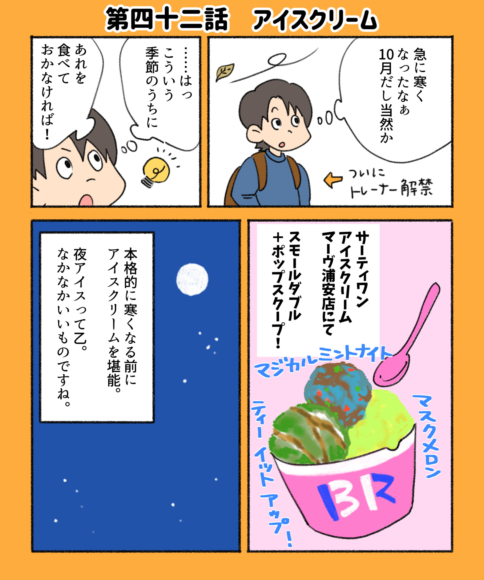 夜のアイスクリームって背徳的だけどいい気分になれるね。