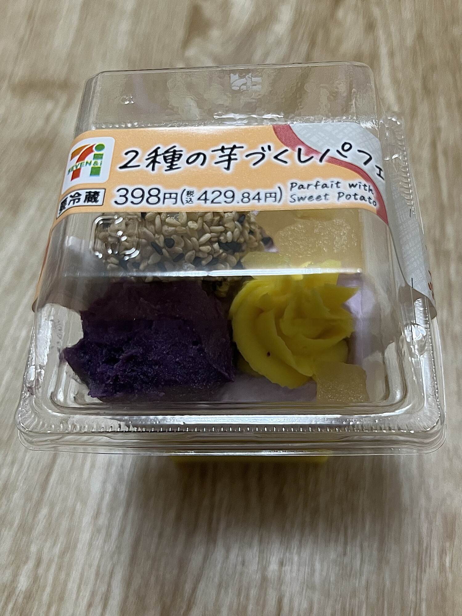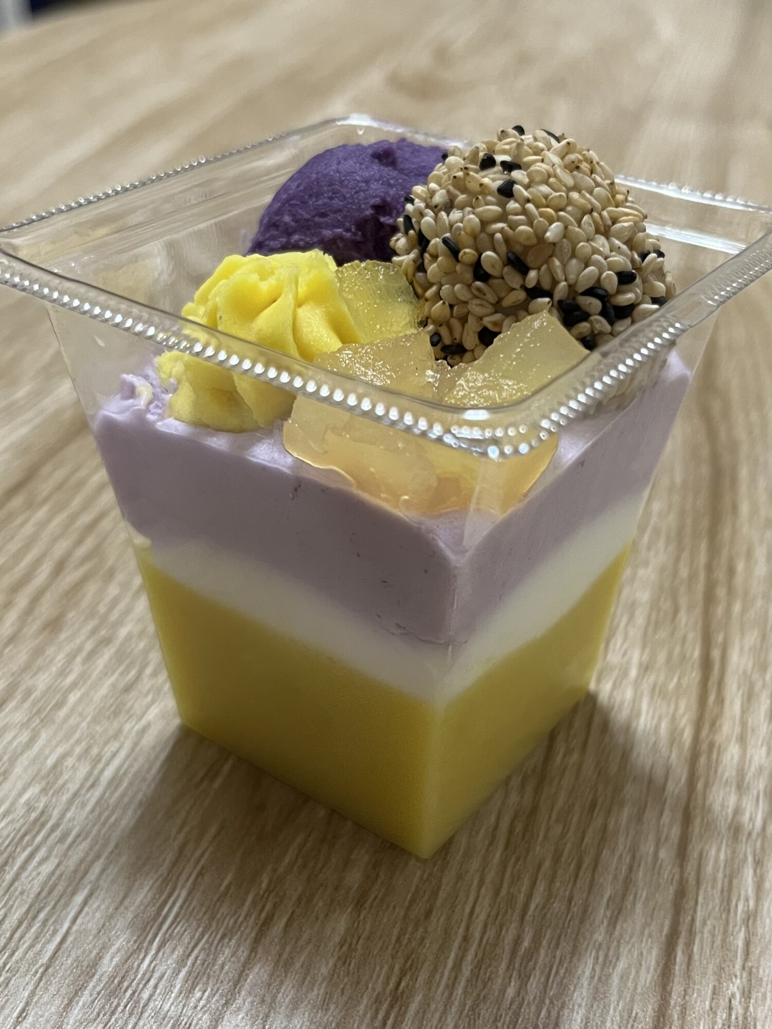 下から、芋ようかん、みるくムースと紫芋ムースの上に、2種の芋あん、こし餡入りのもちもちの胡麻団子、リンゴのシロップ漬けを盛りつけたパフェです。