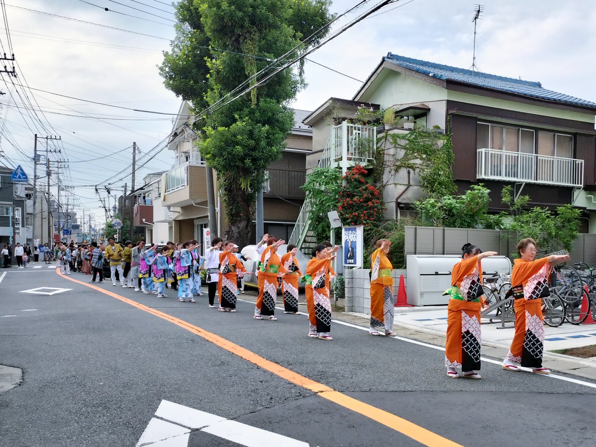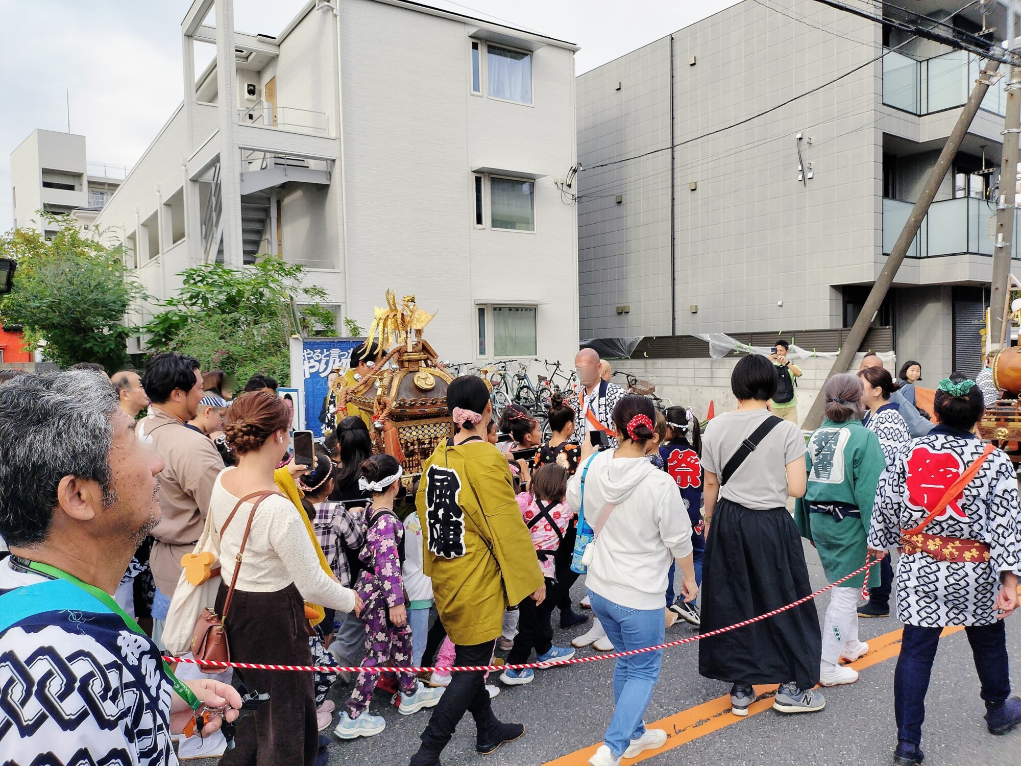 南行徳駅前ロータリーでは、風神太鼓の勇猛な演奏が行われ、午後は旧道沿いをパレードが練り歩き、踊りの列に子ども神輿が続いた。