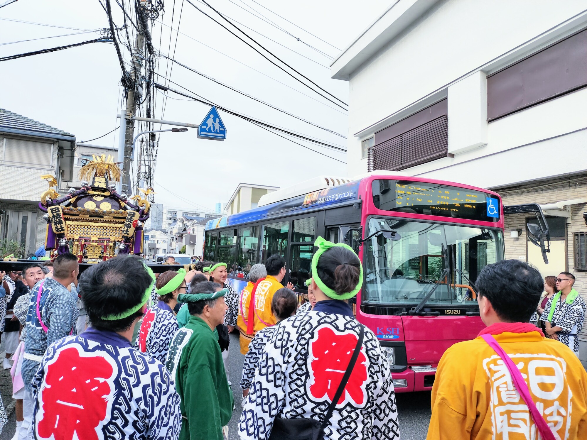 行徳街道を埋め尽くすほどの人・人・人!だが交通規制はしておらず、バスが通る時は神輿を端に移動。バスが去るとまた道路中央に戻って前に進む。