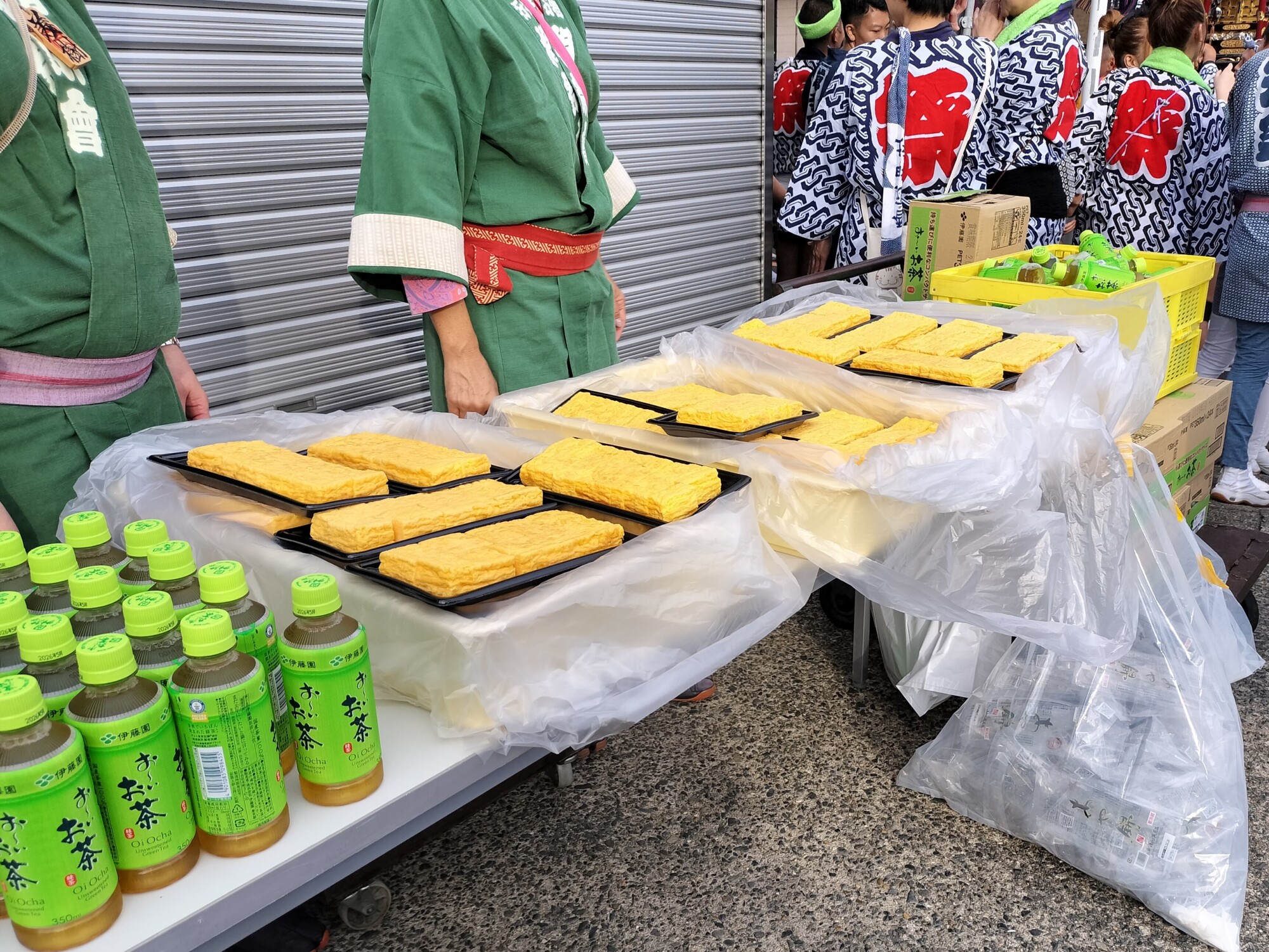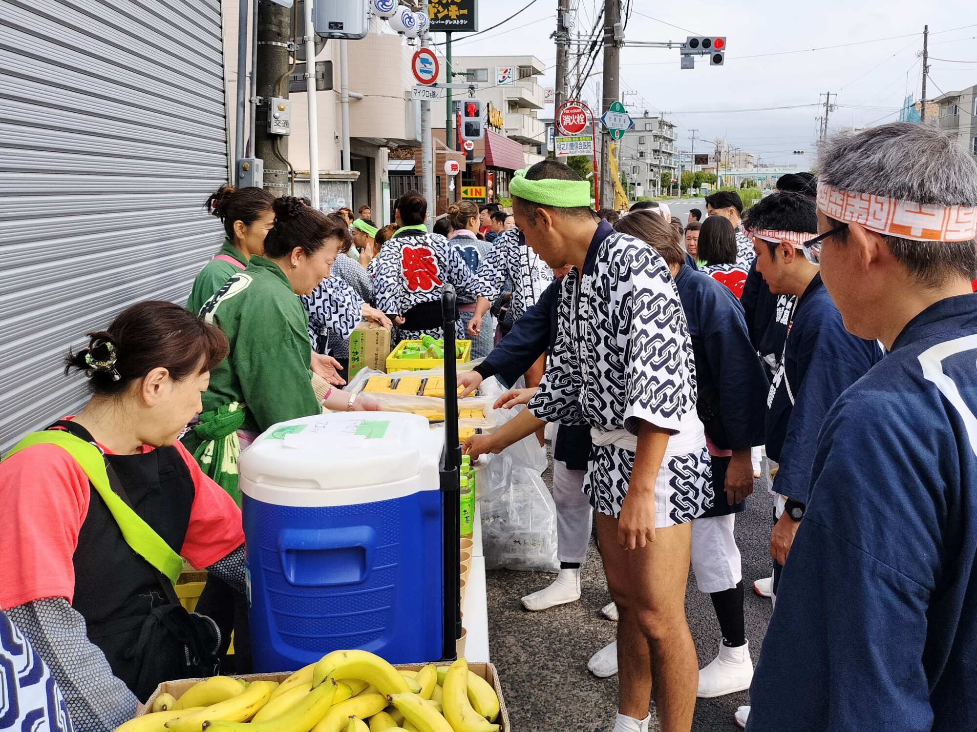 お茶やバナナも用意され、担ぎ手たちが一斉に群がり、美味しそうに頬張っていた。