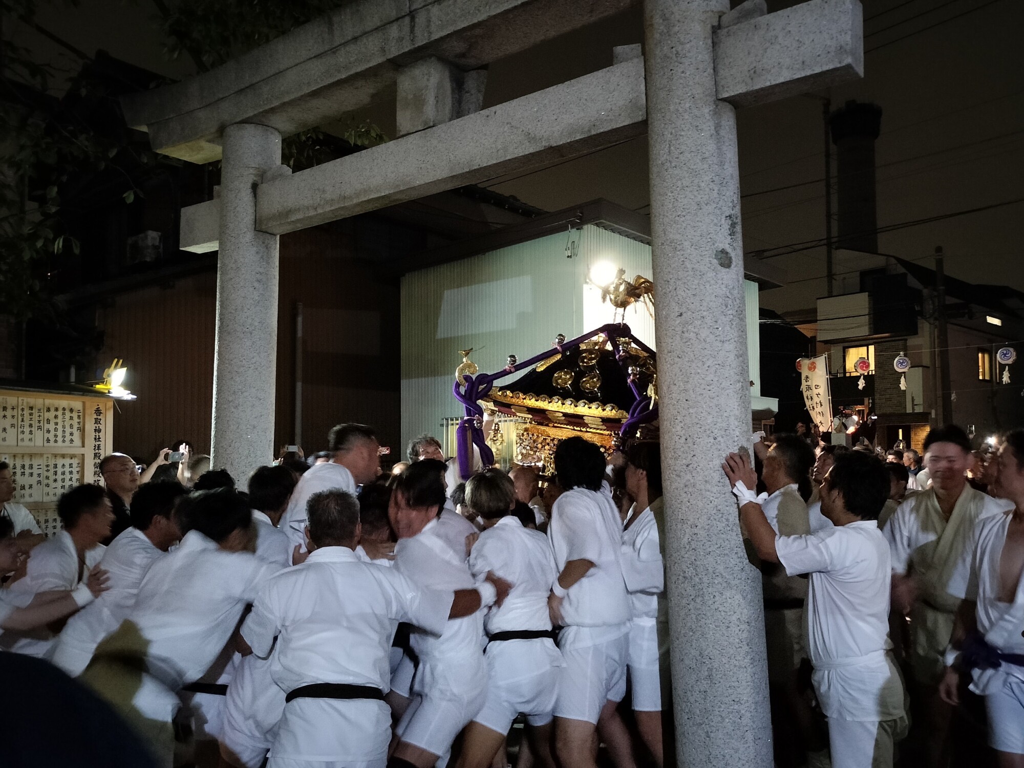 日が暮れた18時ごろ、祭りを終わらせたくない担ぎ手たちがなかなか鳥居をくぐろうとしない。それを押し入れようとする力と、引き返そうとする力で、激しい力比べが行われる。