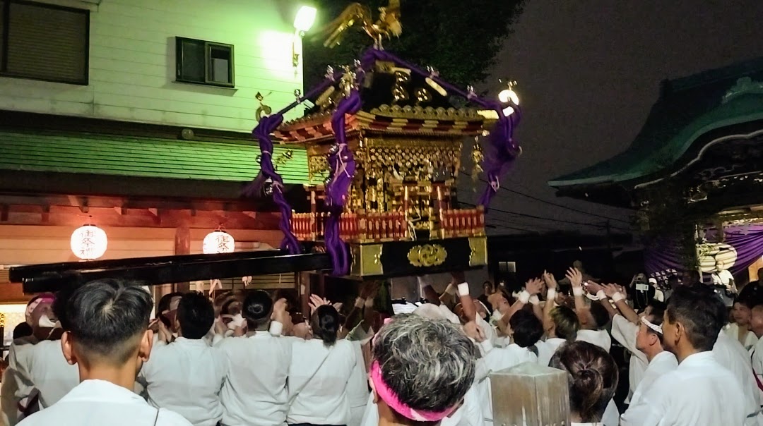 神輿を天に放り上げ、宙に浮いている間に2回手を叩いてから受け止める「放り受け」。