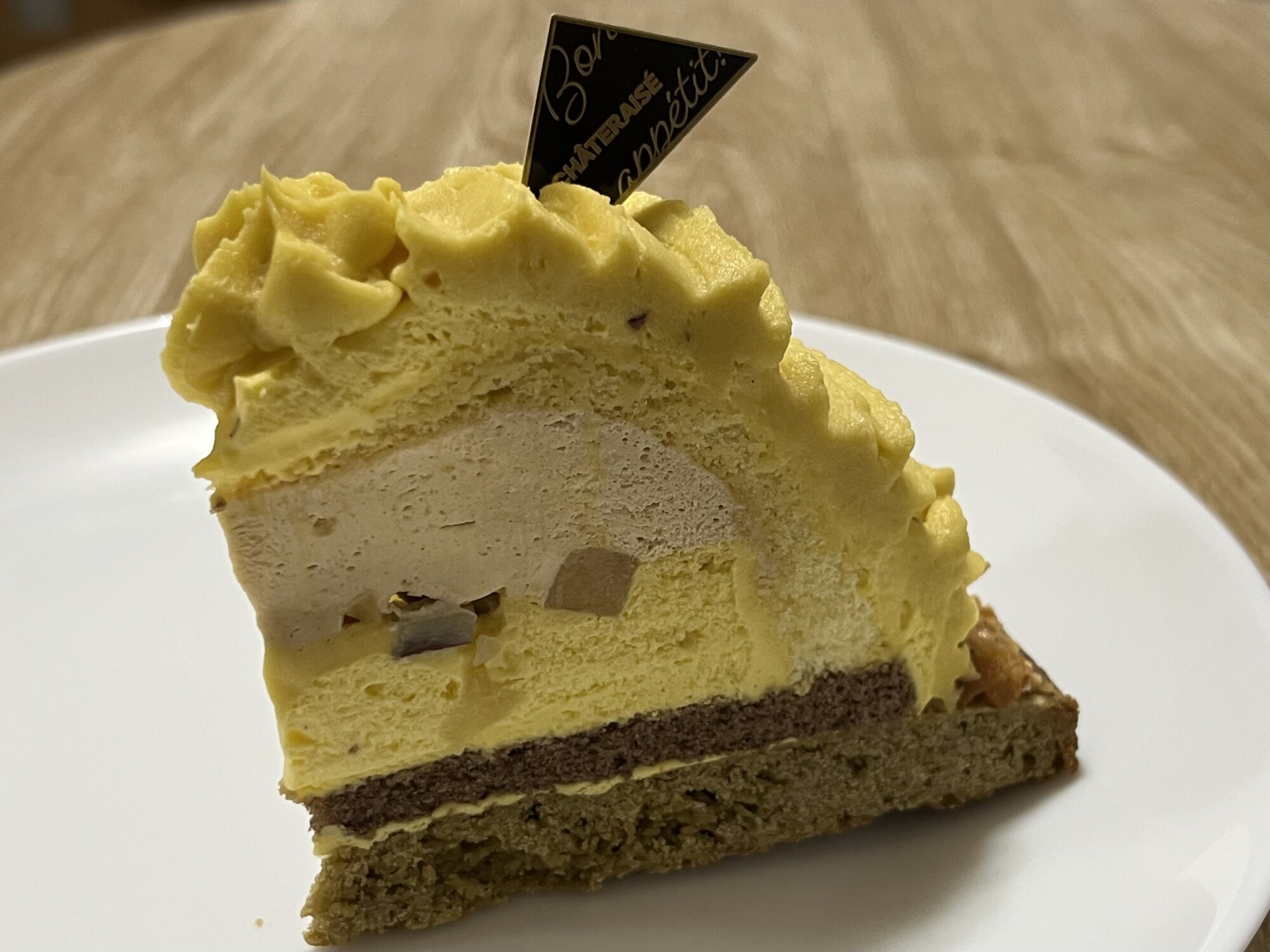 塩味をきかせたサクサクとした食感が特徴のほうじ茶サブレの上にやさしい甘さのシルクスイートクリーム、紅はるかの甘露煮、ほろ苦いキャラメルクリームを重ね、なめらか食感の濃厚シルクスイートクリームを絞ったよくばりケーキ♪