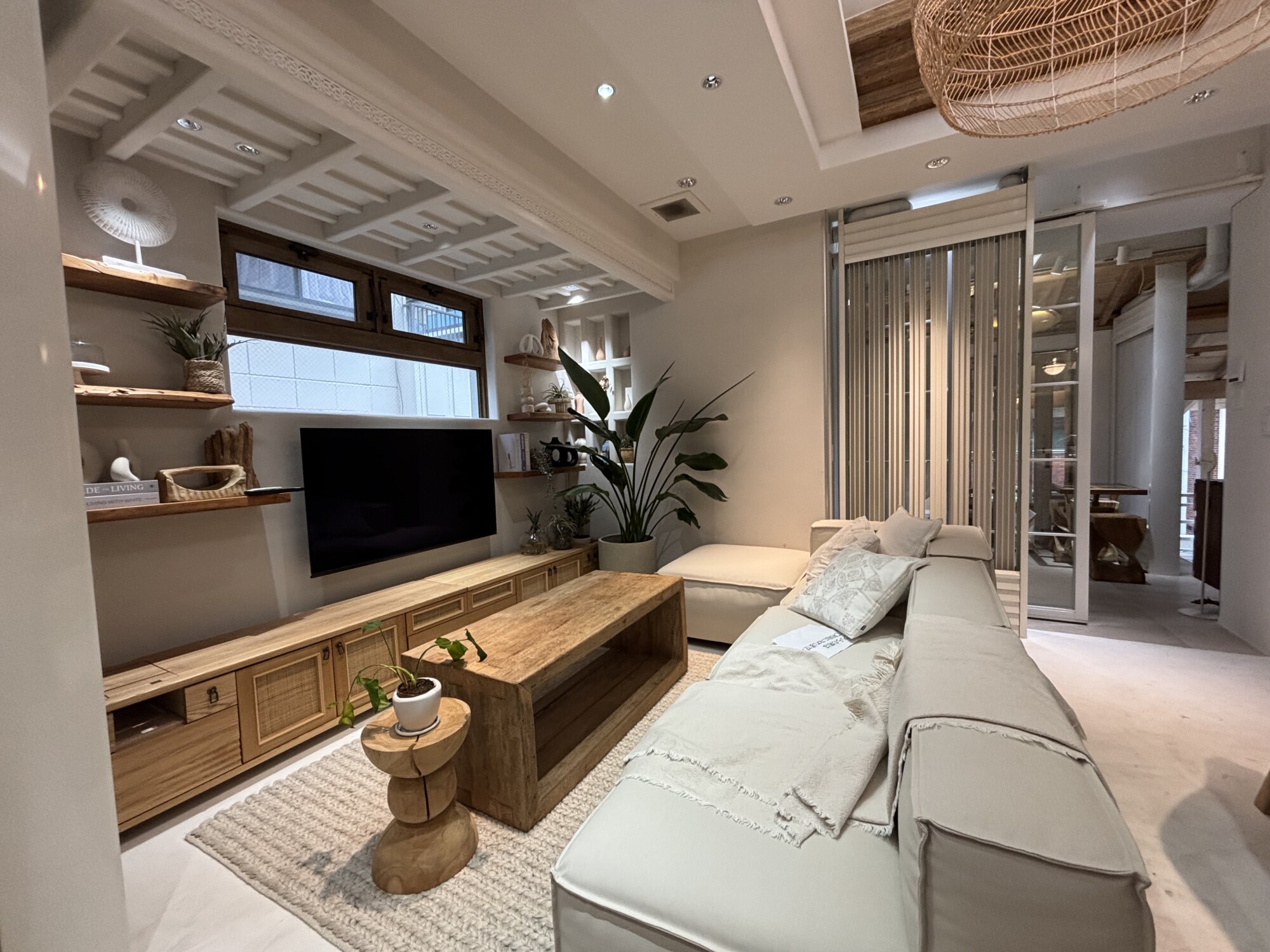 白い壁とウッド調の外観が印象的で、1階はスイーツの販売。