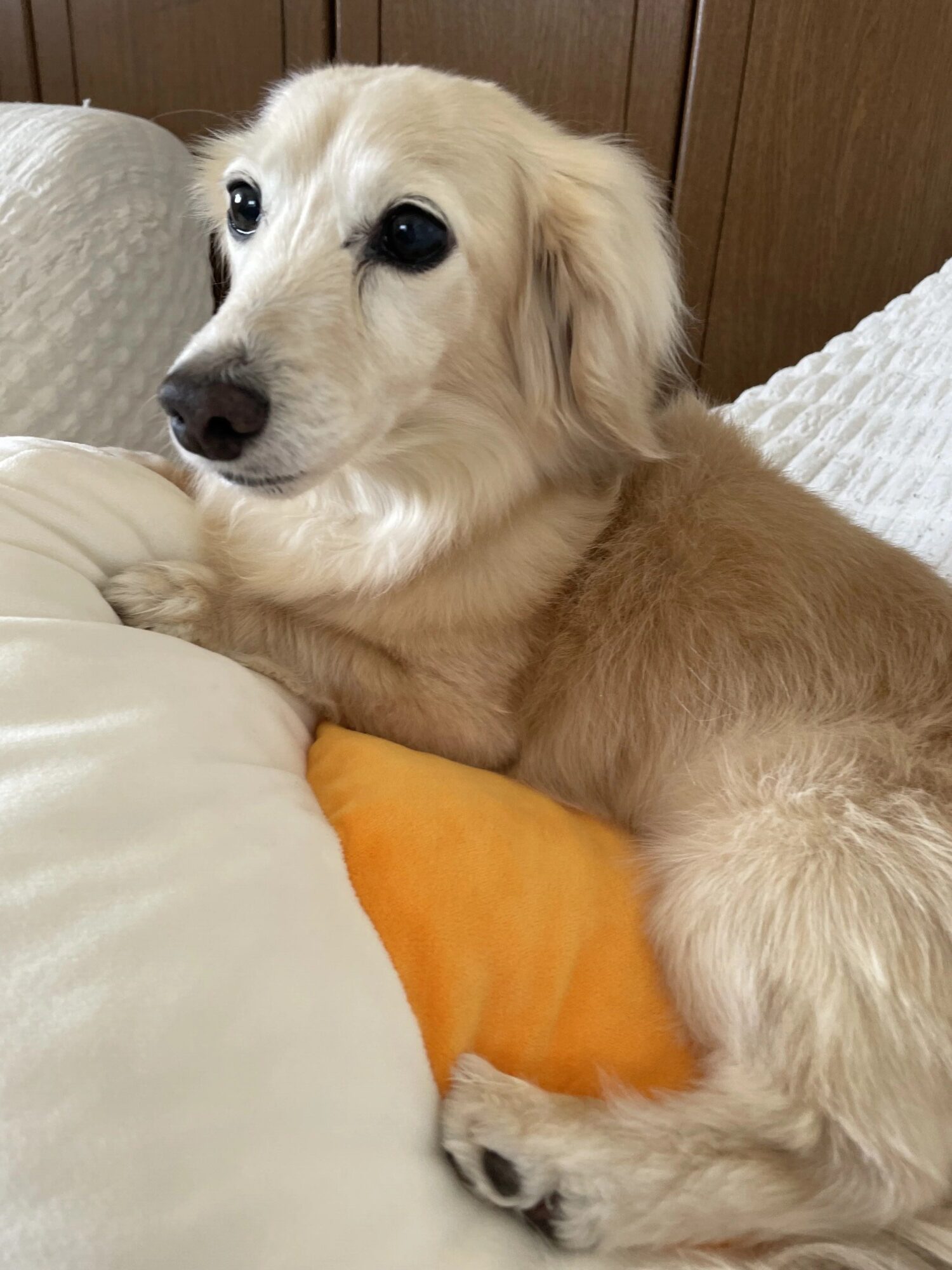 お散歩と子どもが大好きな健太くん。屈託のない仕草が、いつも周りの人たちを笑顔にしてくれています。最近のお気に入りは、枕に顎を乗せて寝る事です!