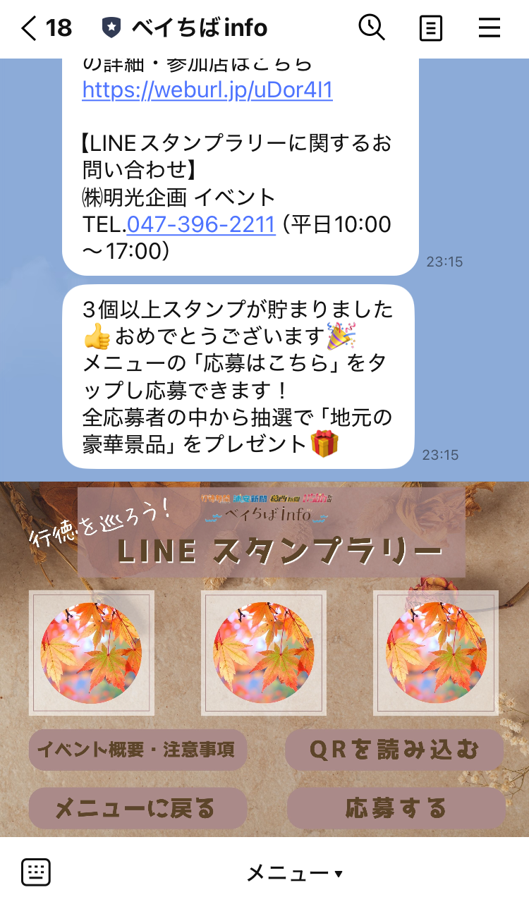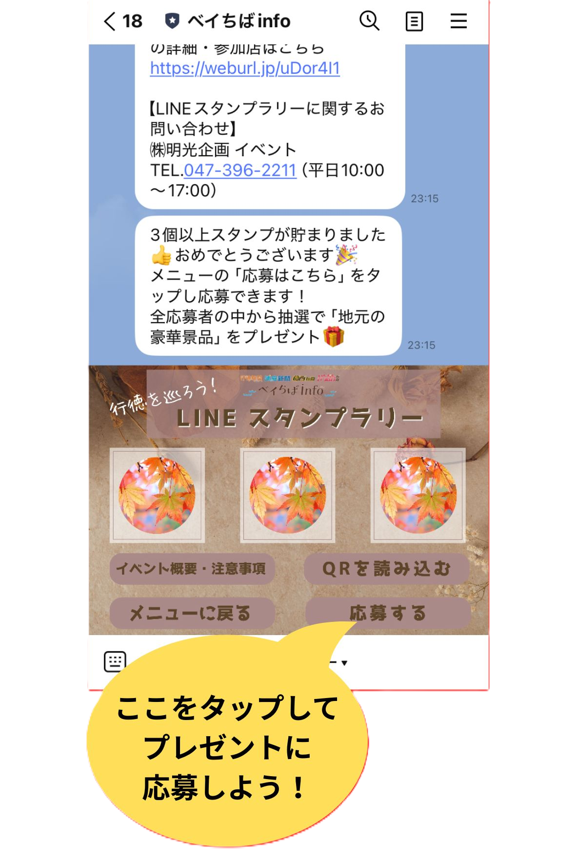 公式LINEアカウント「ベイちばinfo」とお友だち登録をしてスタンプラリーに参加すると、地元のいいものなどが当たる抽選に応募できます!