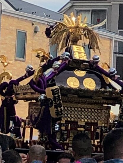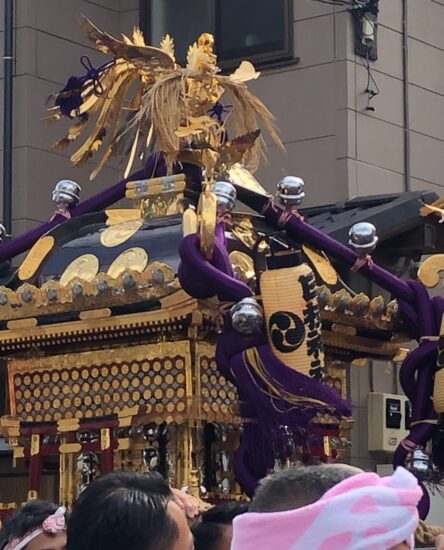 近くにお囃子が聞こえてきたので出てみるとお神輿〜 担ぎ手の皆さんもとてもイキイキ!観ている私たちも何かお神輿パワーを頂けた感じです!