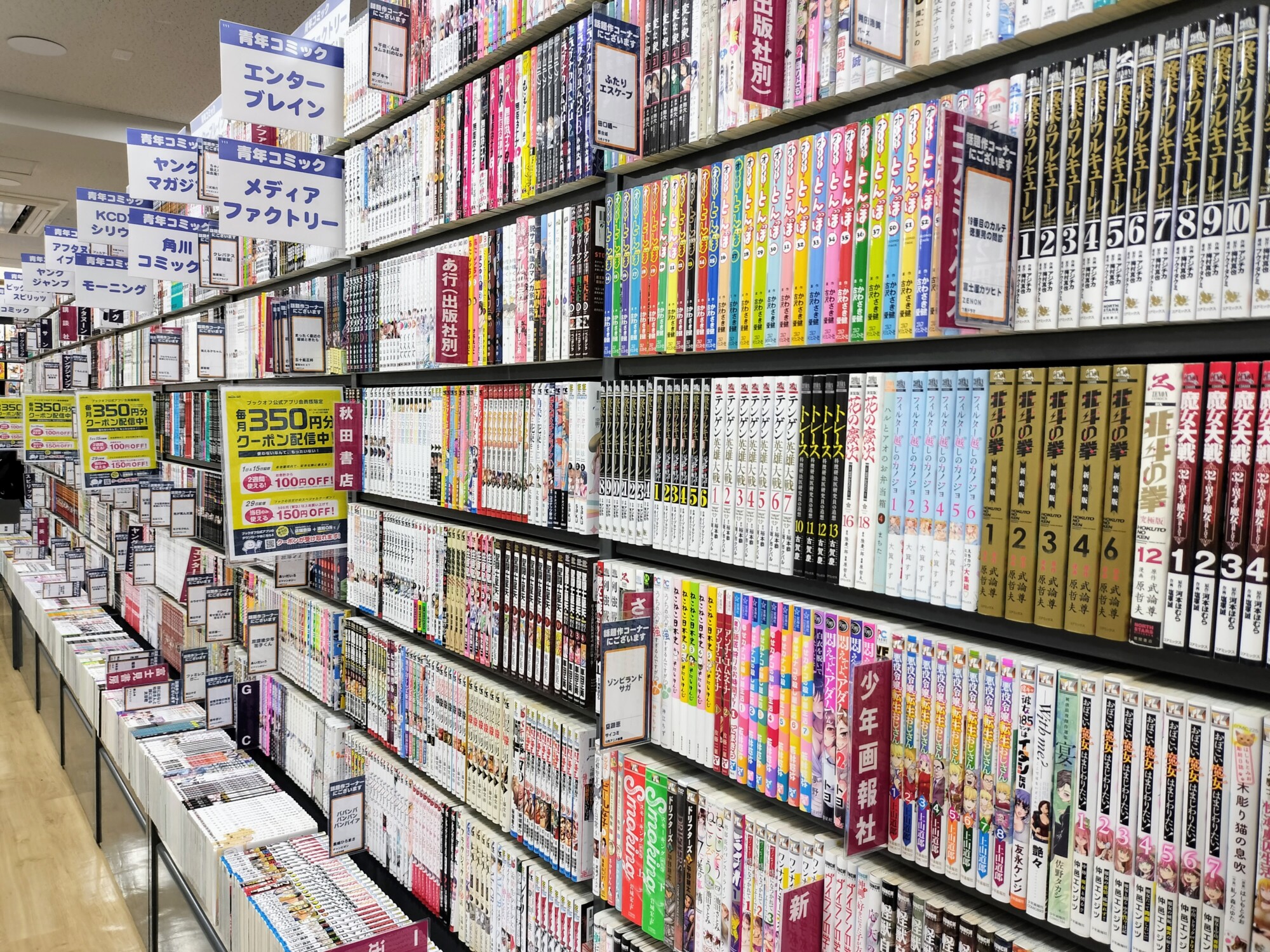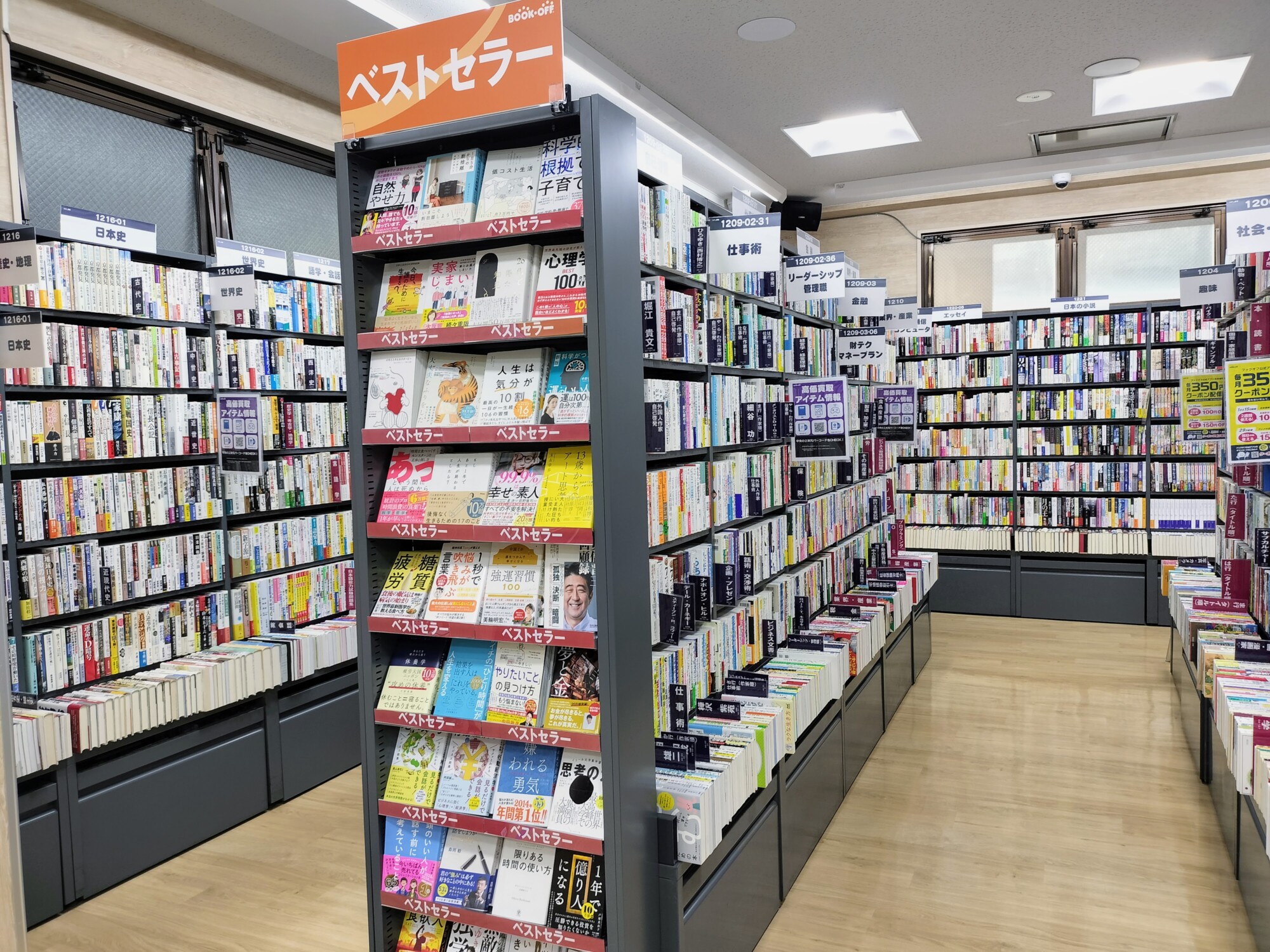 1階の書籍コーナーは、新書や文庫、雑誌、絵本、コミックなど様々なジャンルの本が揃う。ジャンル別の棚はもちろん、「110円~220円」といったような金額で区切られているコーナーもある。