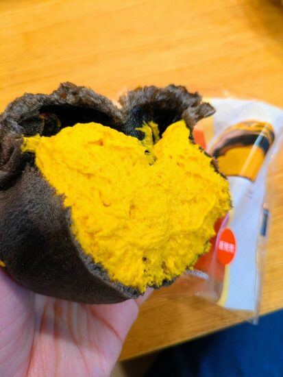 黒色のモチっとしたシュー生地に、濃厚なかぼちゃクリームがたっぷり♪