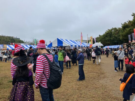 参加者の熱気で雨雲を吹き飛ばして、行徳ハロウィン、予定通り開催されました。 朝から続々と参加者が集まる駅前公園。総勢約700名!会場にはたくさんの模擬店も出店され、美味しいもの楽しいこと満載の会場です!