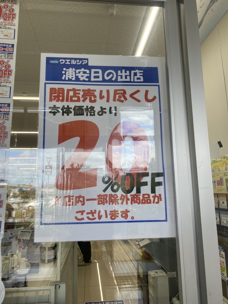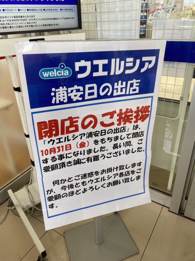 ウェルシア浦安日の出店が10月31日(金)をもって閉店するそうです。