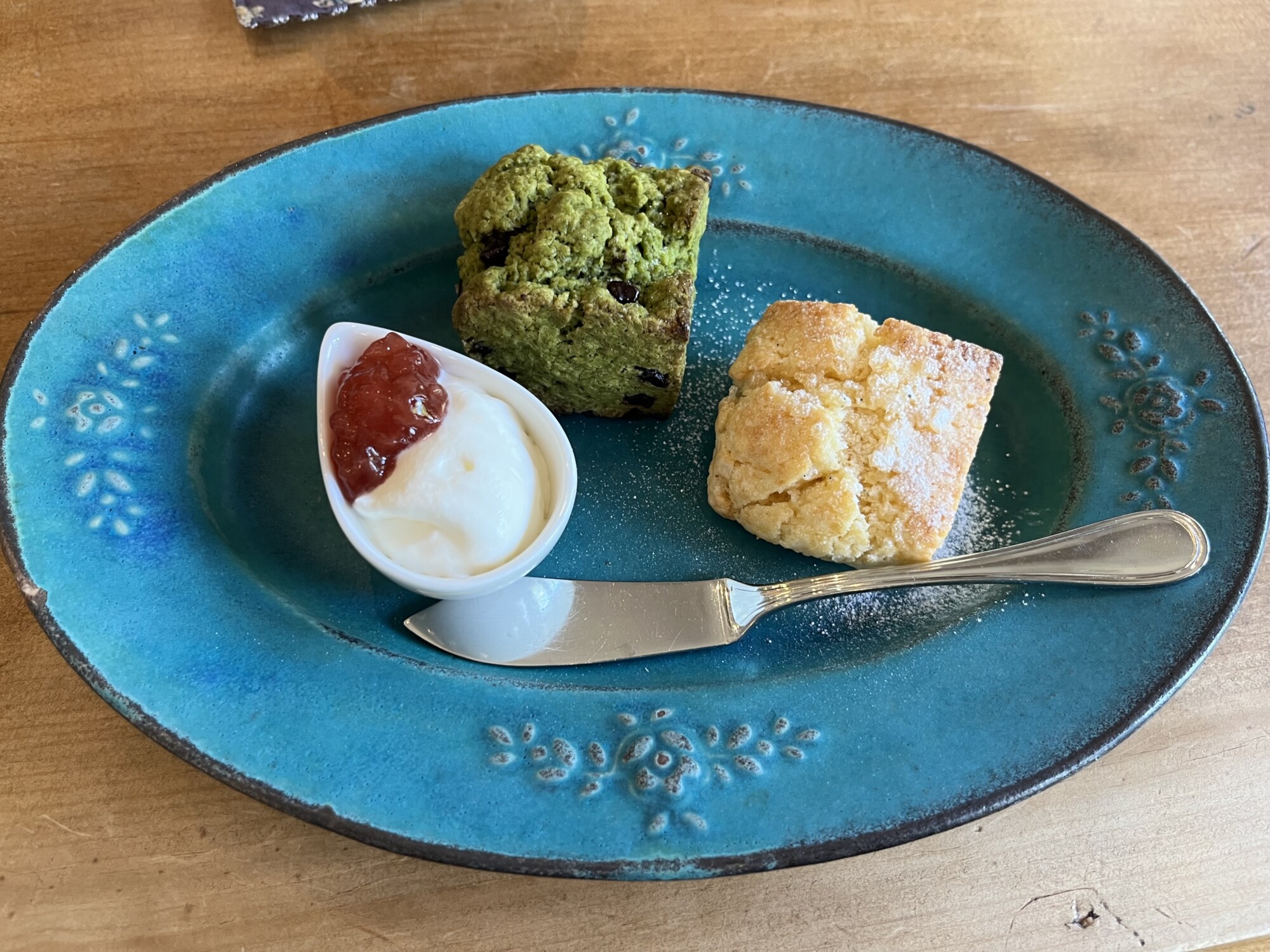 スコーンは、プレーンと抹茶チョコの2種で、いちごジャムとホイップクリームが添えられています。