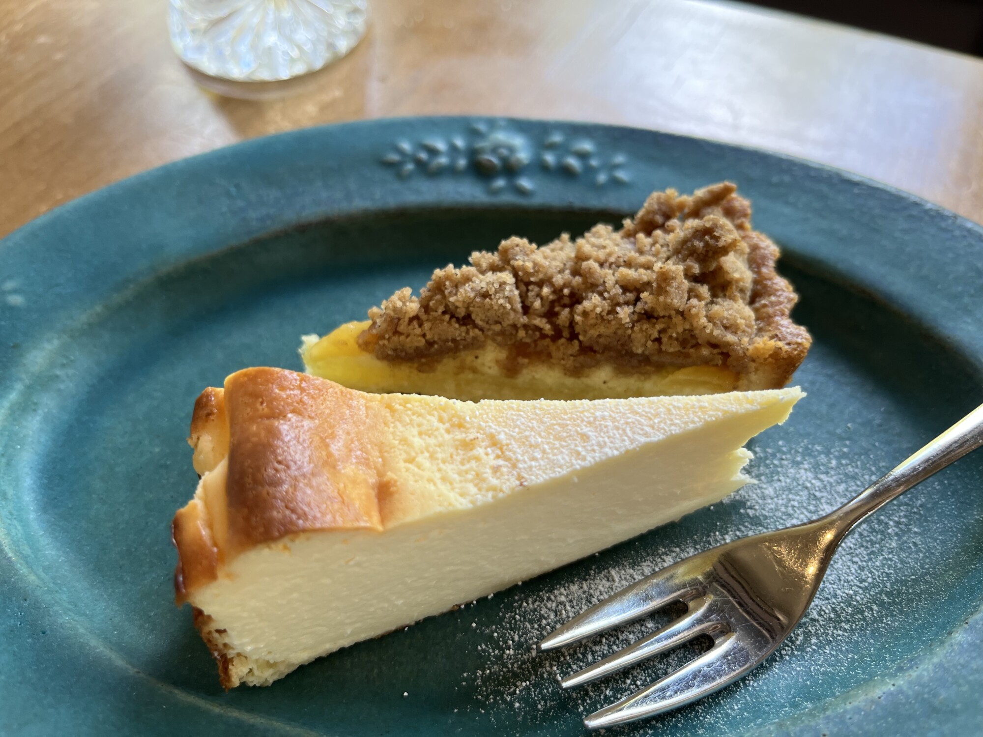 バスクチーズケーキと、桃のクランブルタルトの2種。