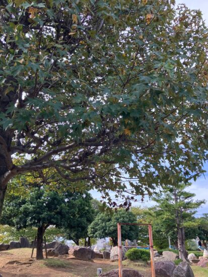 えんぴつ公園で見つけたトゲトゲした丸い実つけた樹。モミジバフウというそうです。確かに葉っぱがもみじに似てますね。 秋にはきれいに紅葉するそうなので楽しみです。