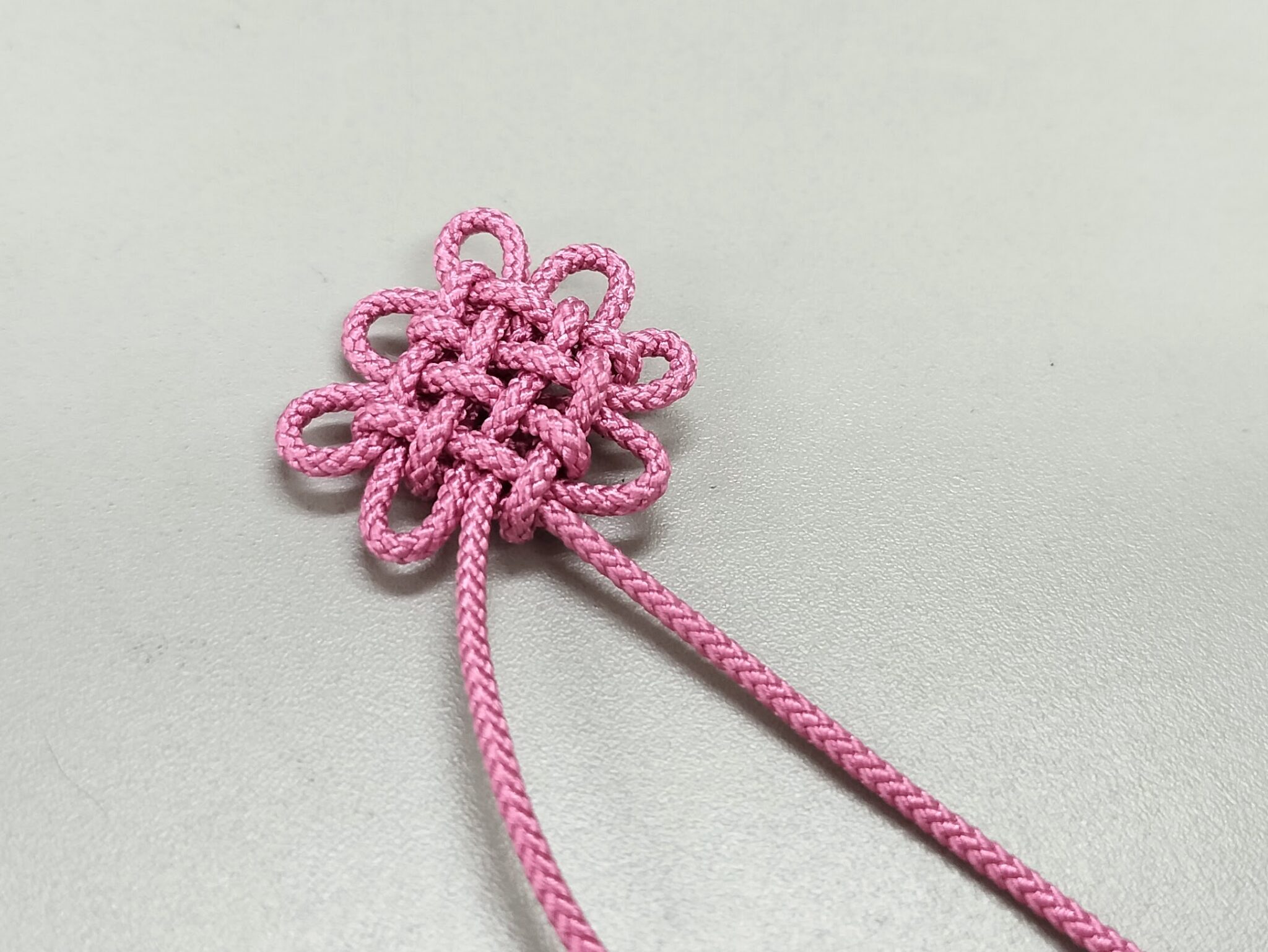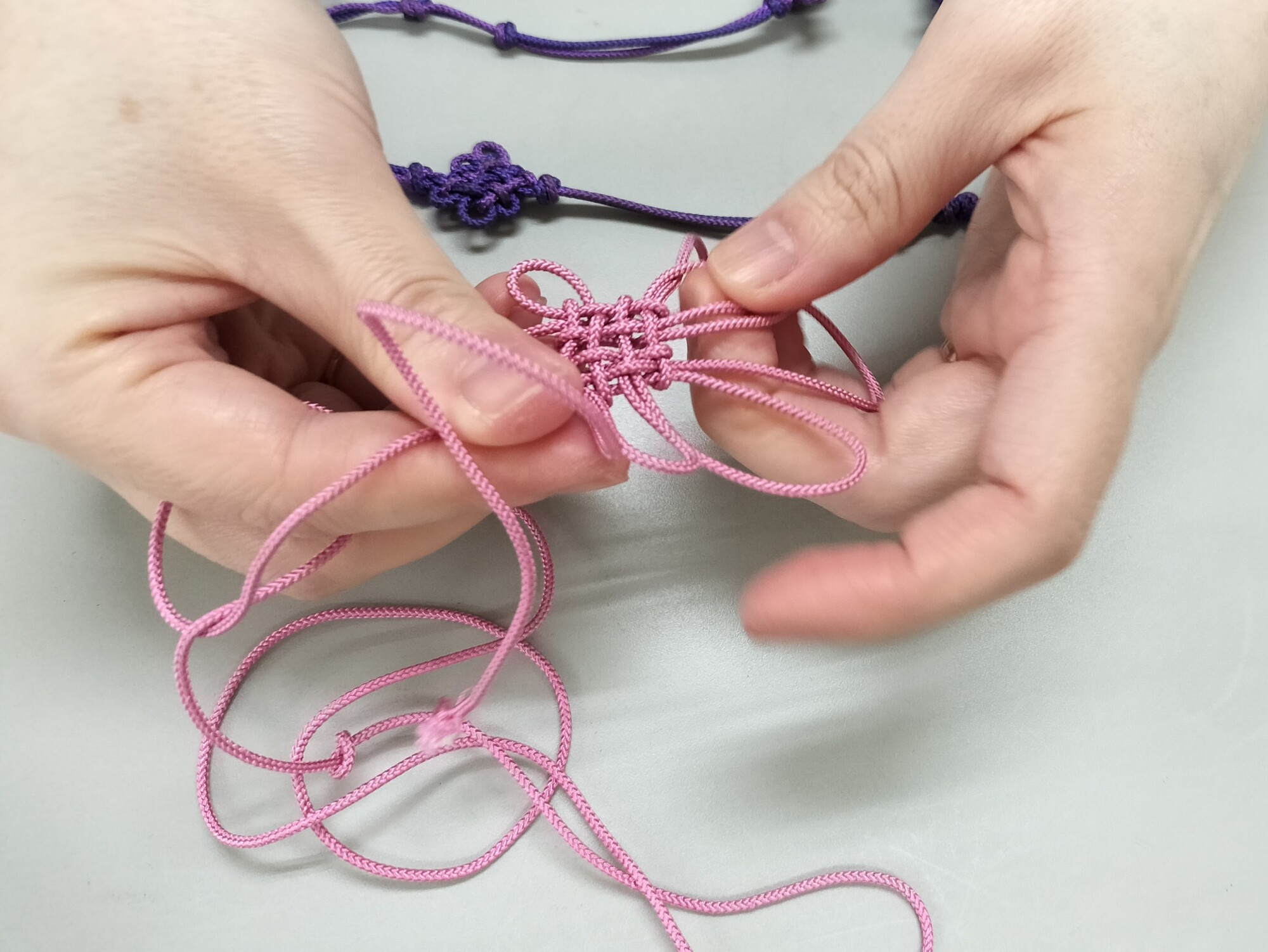 仕上げに、目打ちのような器具で紐を細かく整え、美しい結び目や花びらが形作られていく。できあがったのは菊。”成長”を意味する結び方だ。