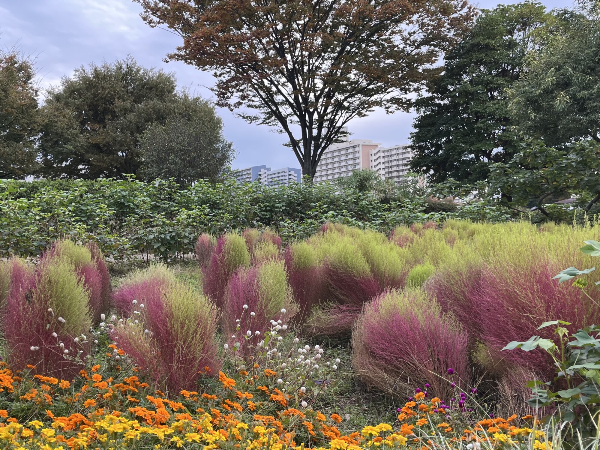秋になるとバラ園の大花壇に植えられたコキアが真っ赤に染まります。