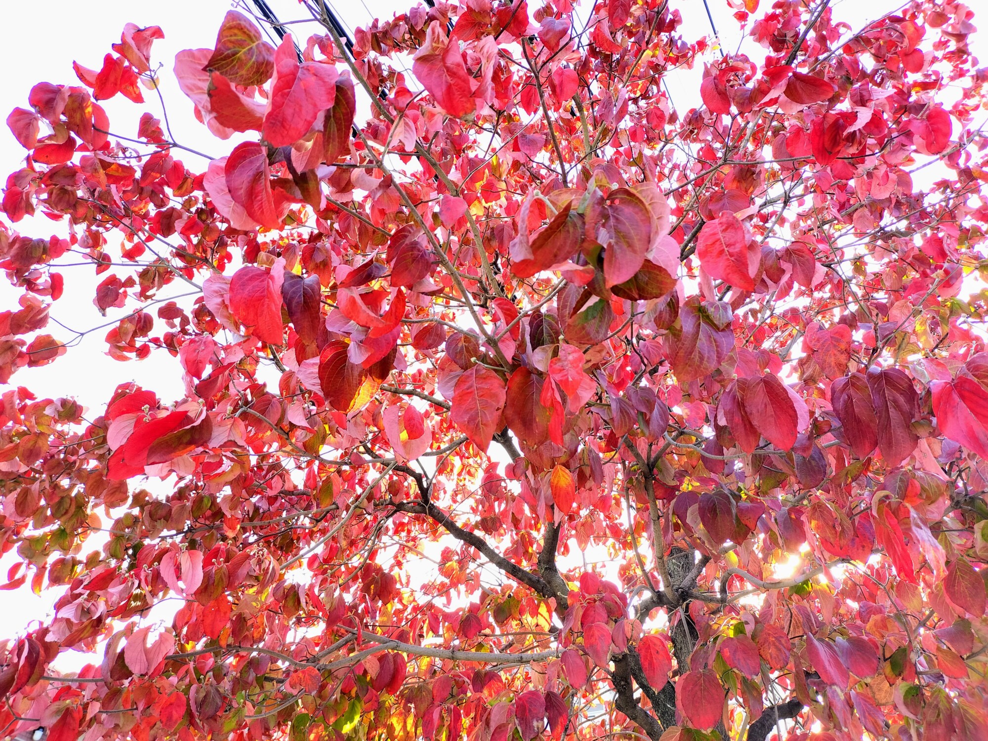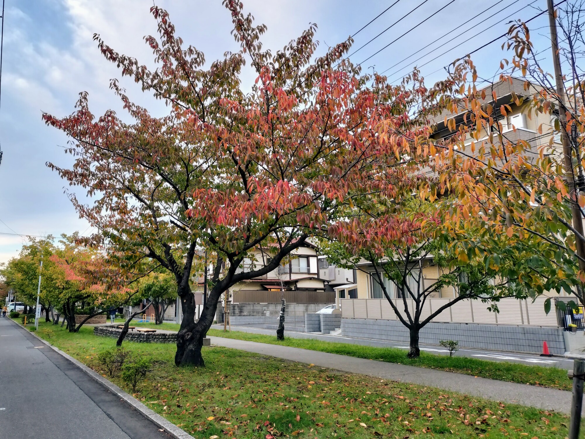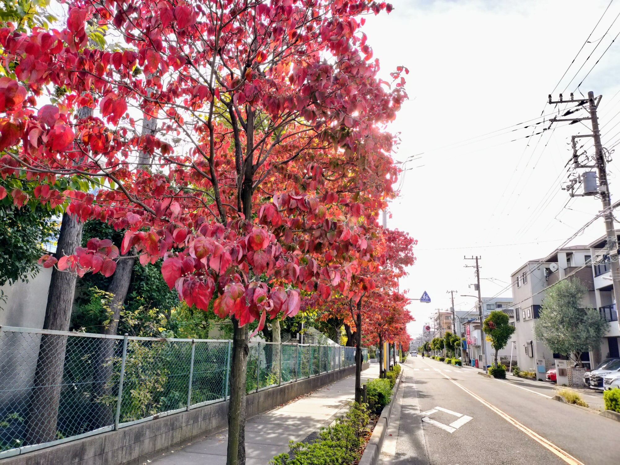 富美浜小学校の前あたりから福栄2丁目にかけての通り沿いの街路樹はハナミズキ。密集しているわけではないが、赤々と燃えるような色合いが美しい。ドライブやサイクリングで走るのにオススメ。