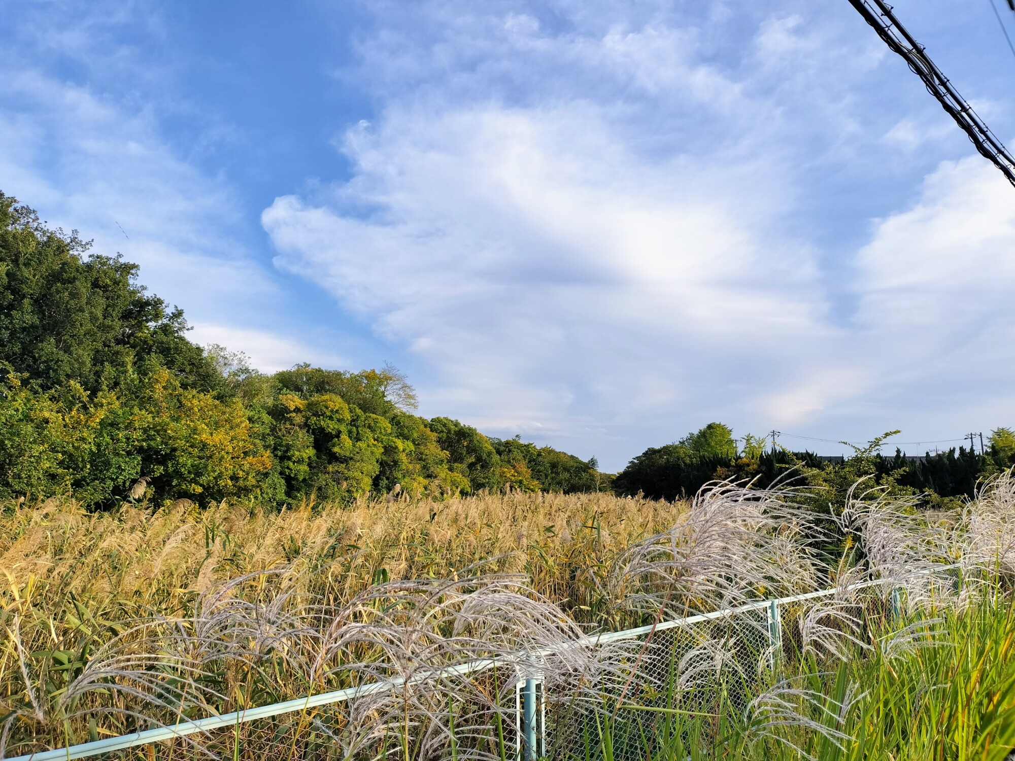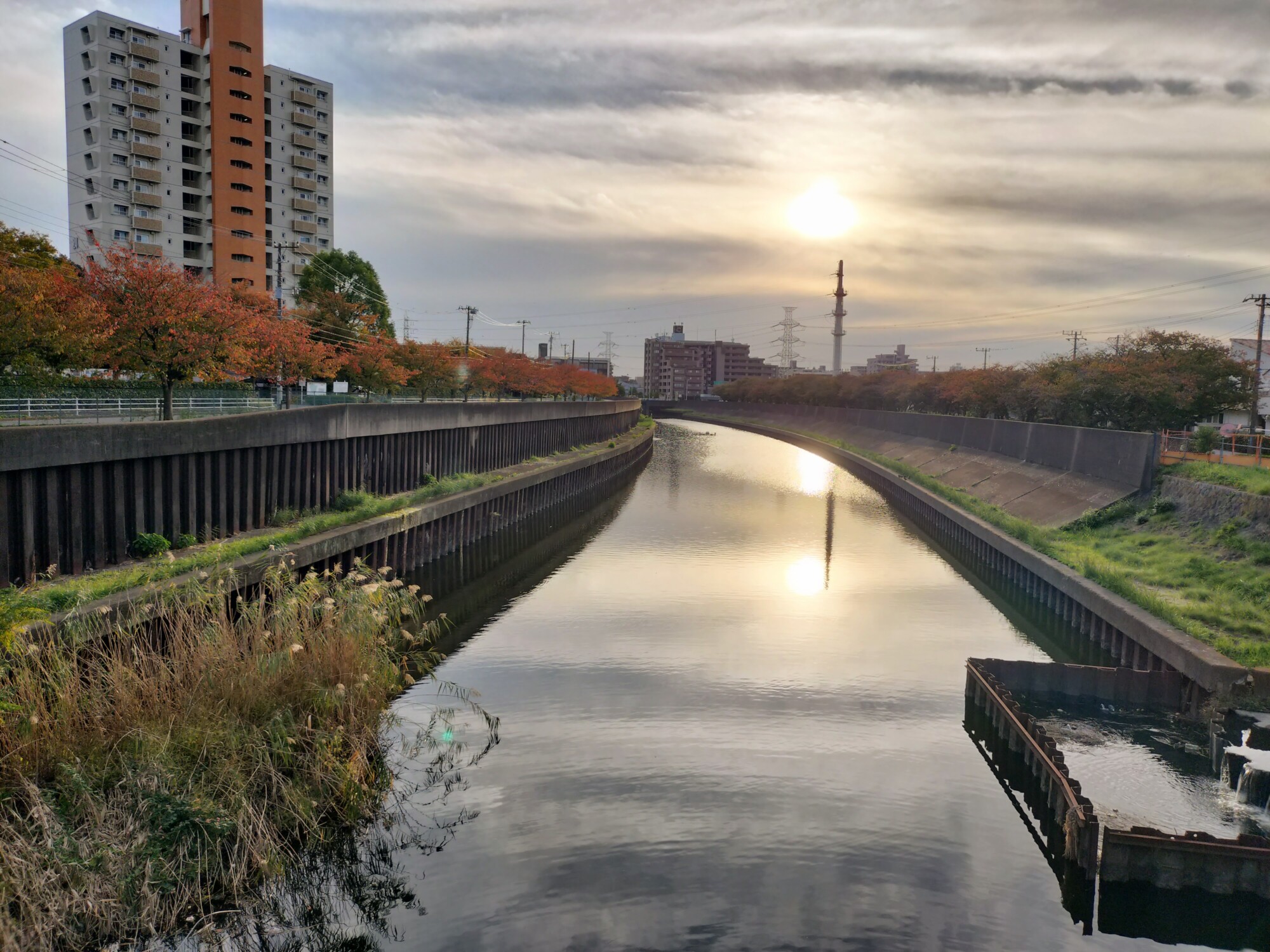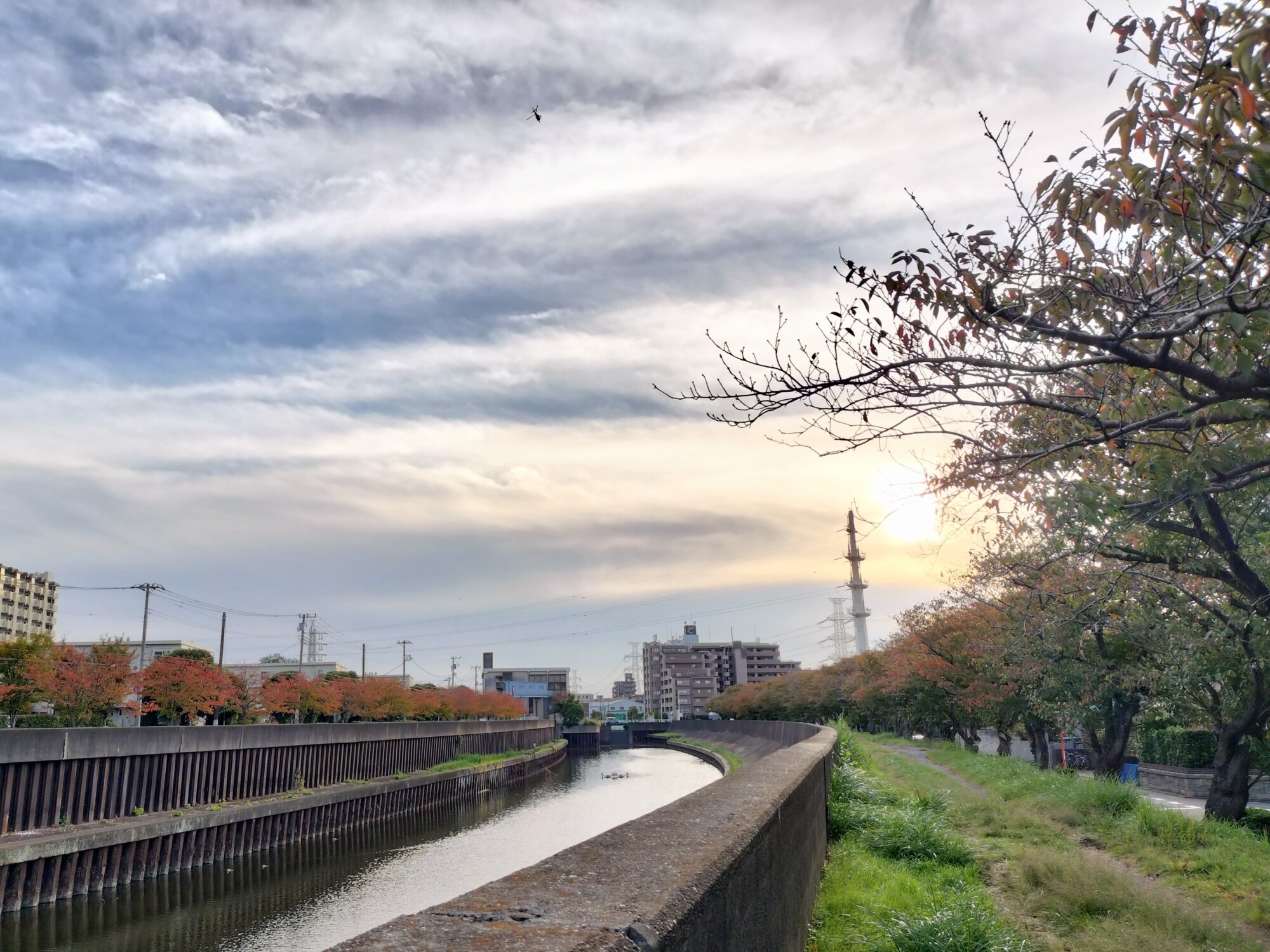 桜の名所としておなじみの猫実川。ハイタウン塩浜の近くのエリアの堤防沿いの桜並木は、秋には赤や黄色に葉が色づき、この季節もまた美しい。日が傾いた頃に塩浜橋へ行くと川に反射した陽光にススキの穂が透けるのでオススメ。