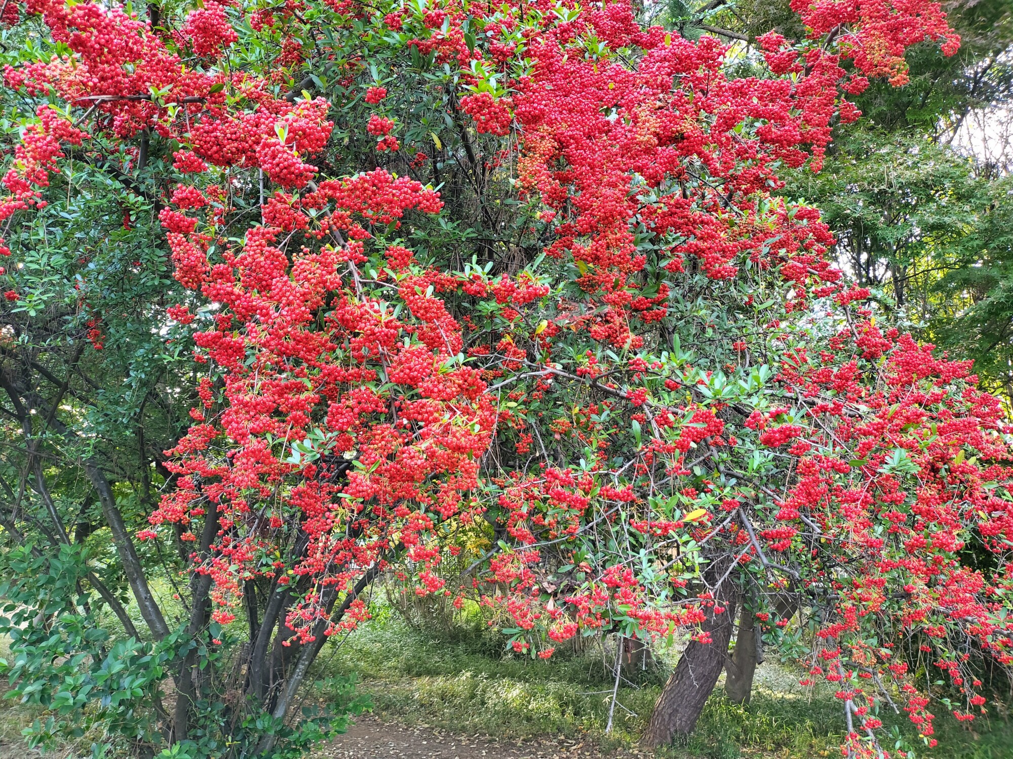 比較的常緑樹が多い行徳鳥獣保護区。福栄からあいねすとへ向かう入口付近にある湿地は、ススキと葦の穂が風に揺れる。緑道に入ればイチョウの並木が。あいねすとを超えるとピラカンサの赤い実がたわわに実っている。