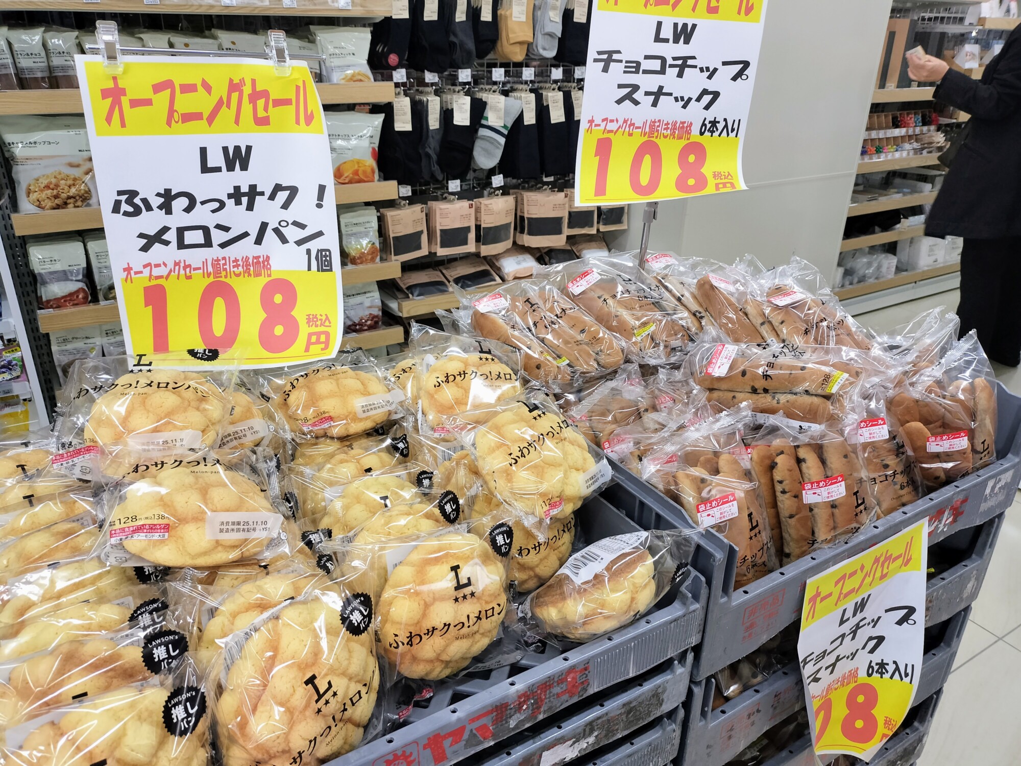 店内には、「ふわっサク!メロンパン」が108円、チョコチップスナック(6本入り)が108円とセール価格で販売されており、ワゴンに山積みになっていた。