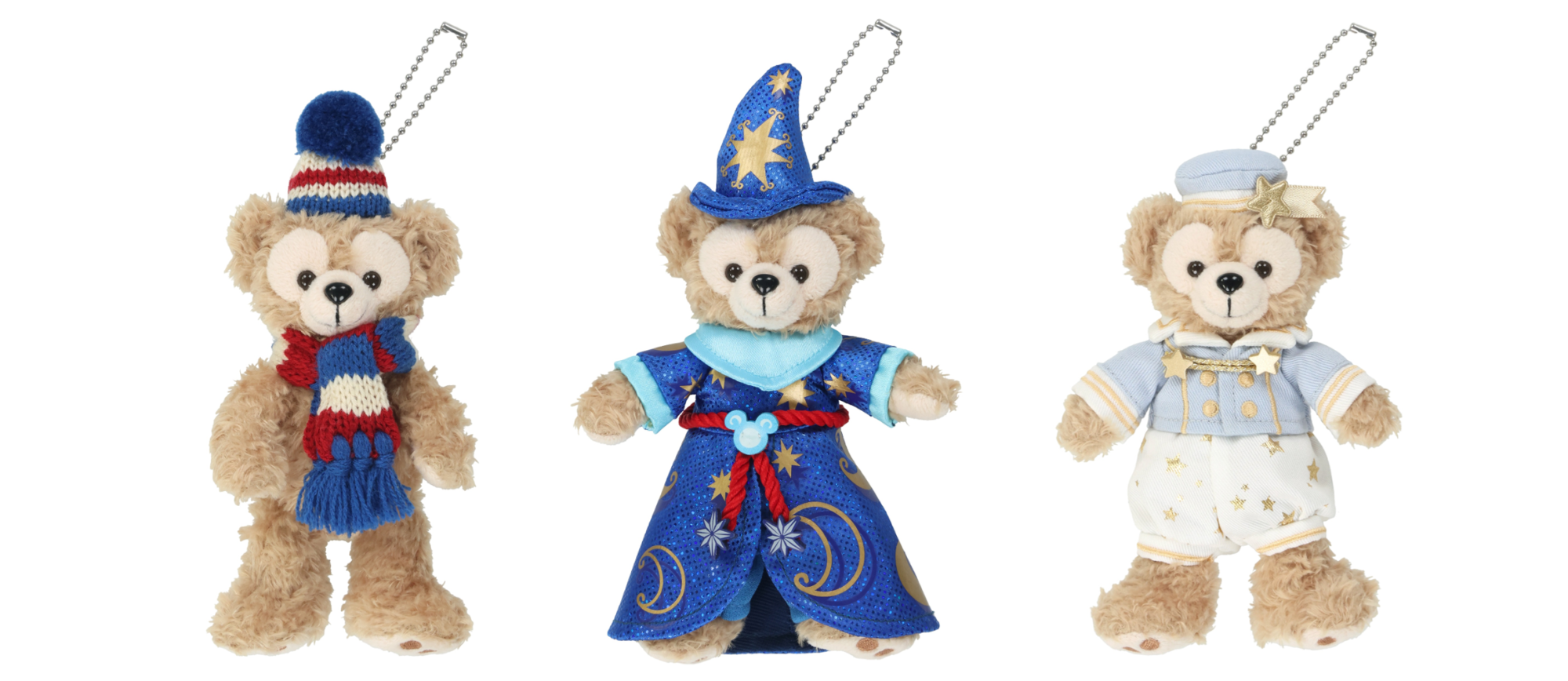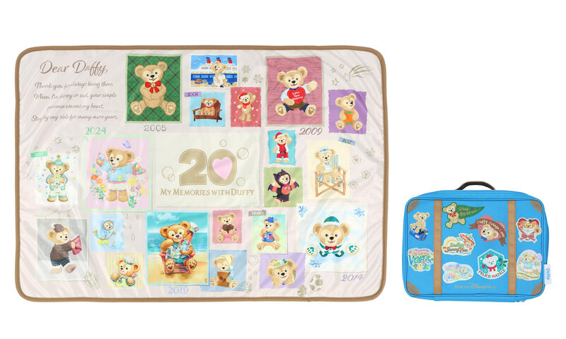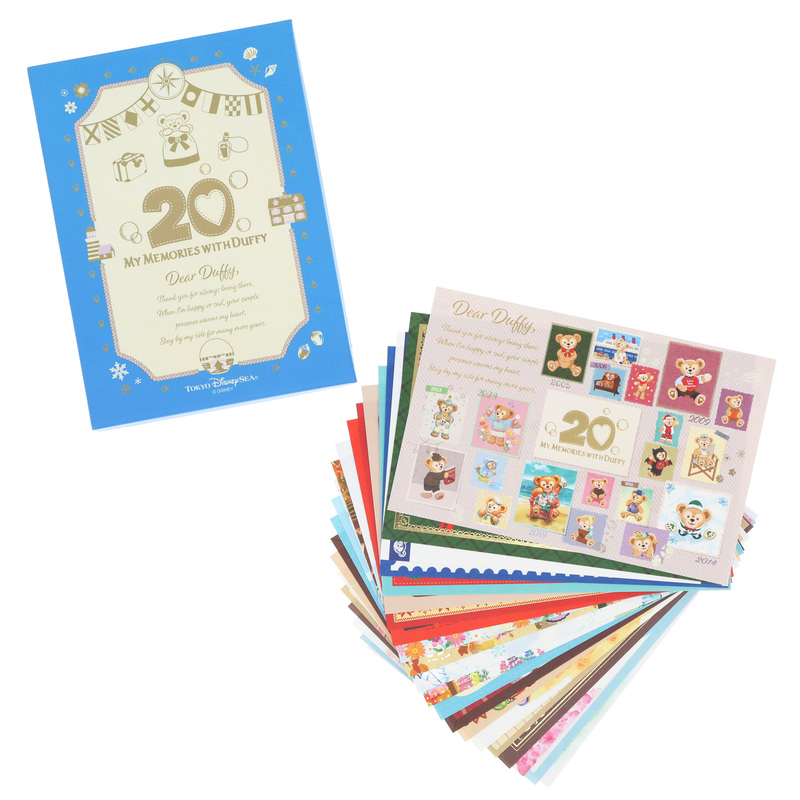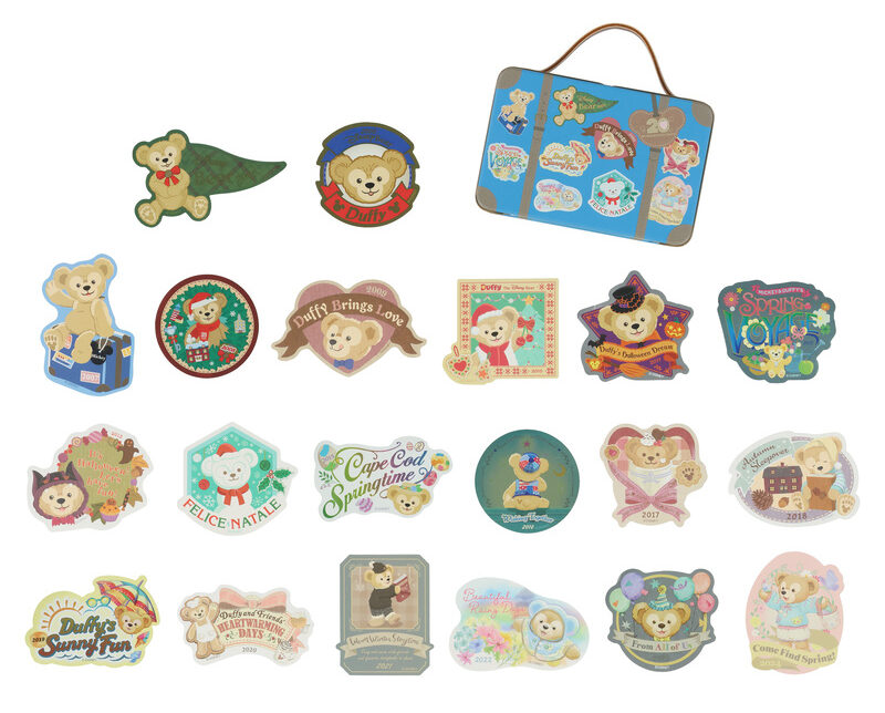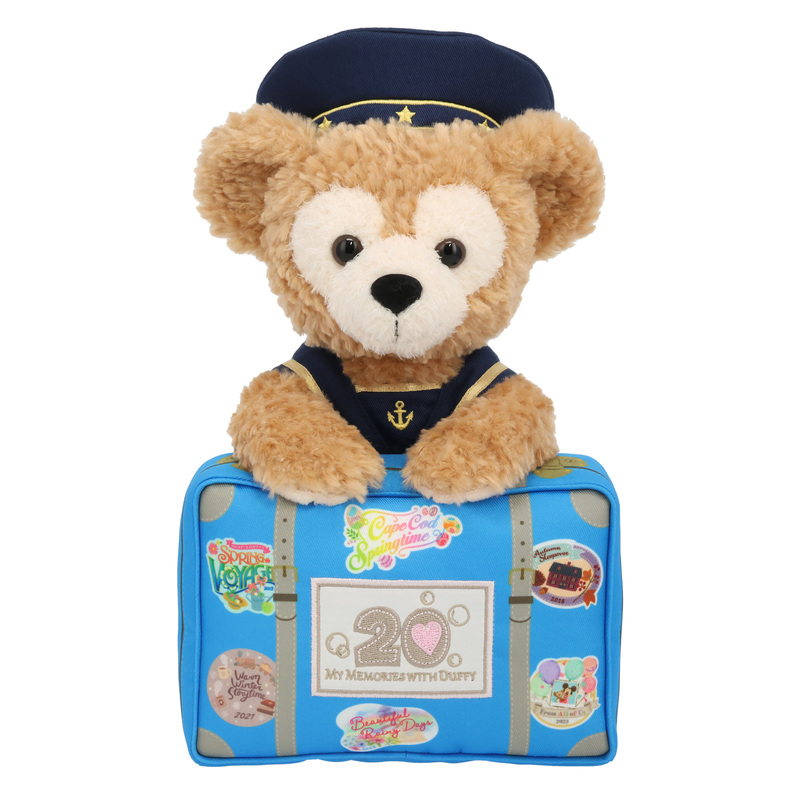 過去のプログラムで描かれたダッフィーのアートをモチーフにした BOX 入りのポストカードセットや、トランク型のケースに入ったステッカーセット、そしてきんちゃくセットが登場。また、アルバムに見立てた本型のケースの中に、「ダッフィーデビュー(2005 年)」や「ミッキーとダッフィーのスプリングヴォヤッジ(2012 年)」など、過去のプログラムを思い返せるフィギュア(5 種類)と 20 周年デザインのトランクを抱えながらこちらを見ている愛らしいダッフィーのぬいぐるみも発売します。