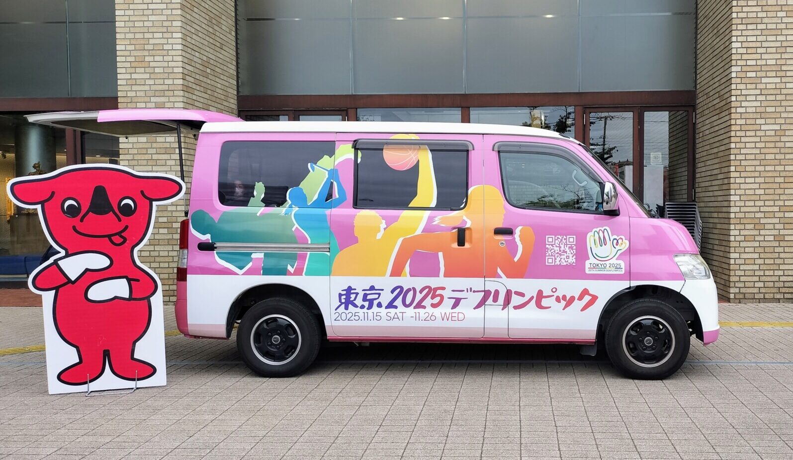 デフリンピックは耳が聞こえない、聞こえにくい選手による国際スポーツ大会で、1924年に始まり、4年ごとに開催されている。2025年の開催地は日本。日本では初開催となる。この「東京2025デフリンピック」をPRするため、北と南から2台で全国を巡回しているデフリンピックキャラバンカーが浦安に登場。10月21日(火)、浦安市役所前の広場で展示イベントが開催された。