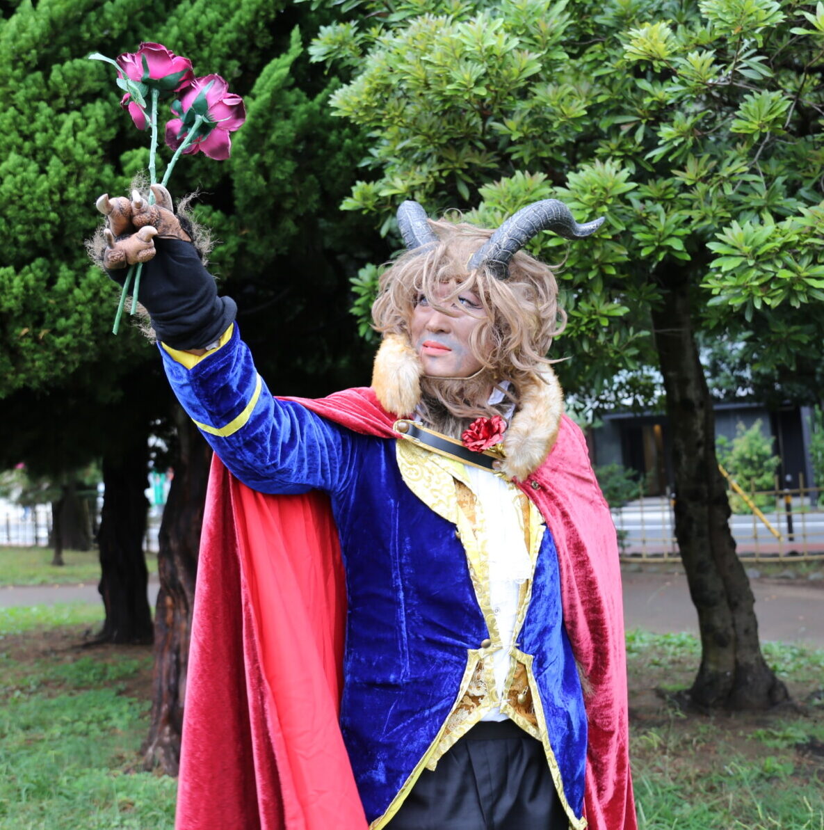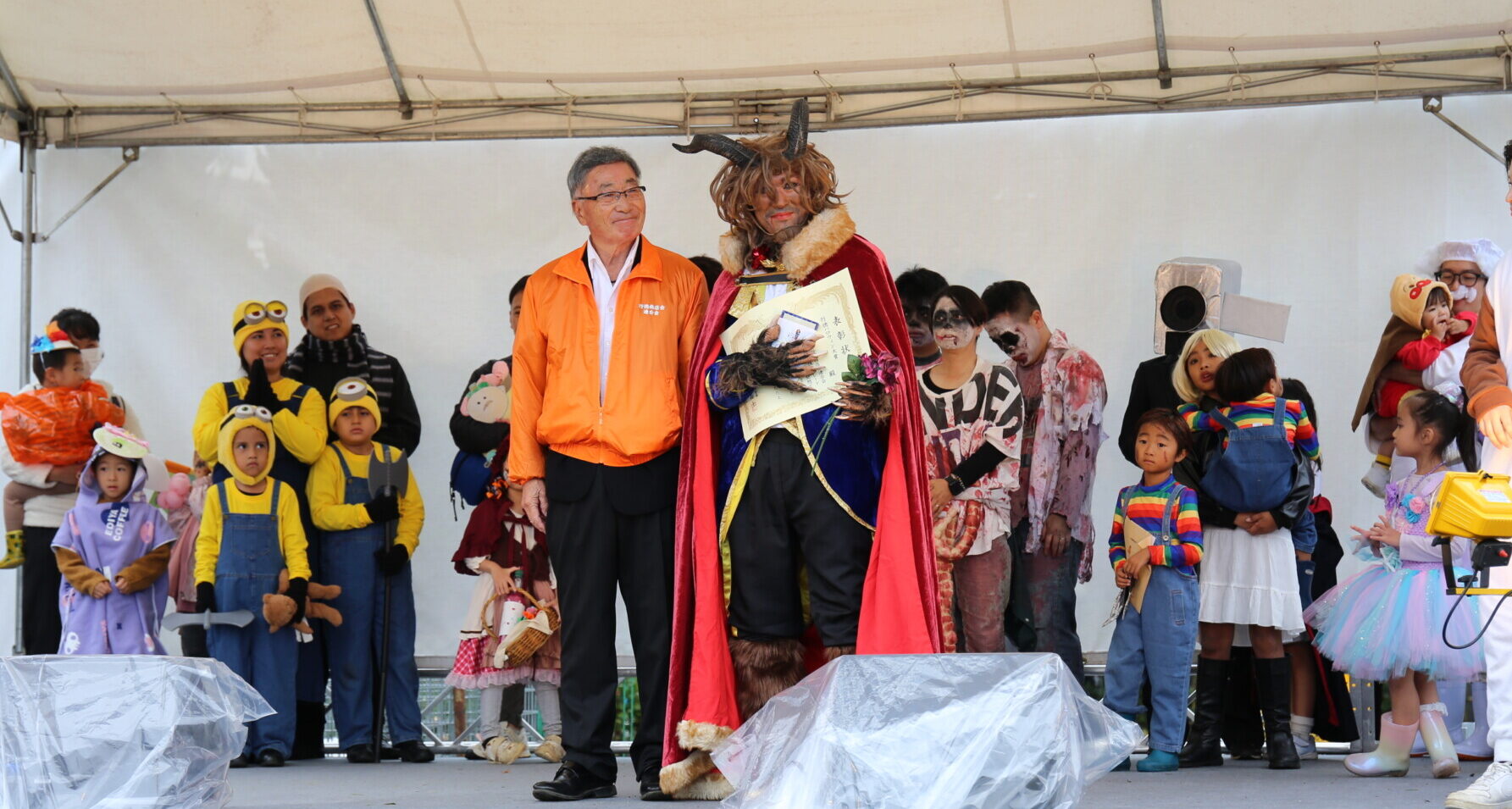 今年のハロウィン大賞は市内在住男性の「バラを持った野獣」が受賞。受賞者には賞状が渡された
