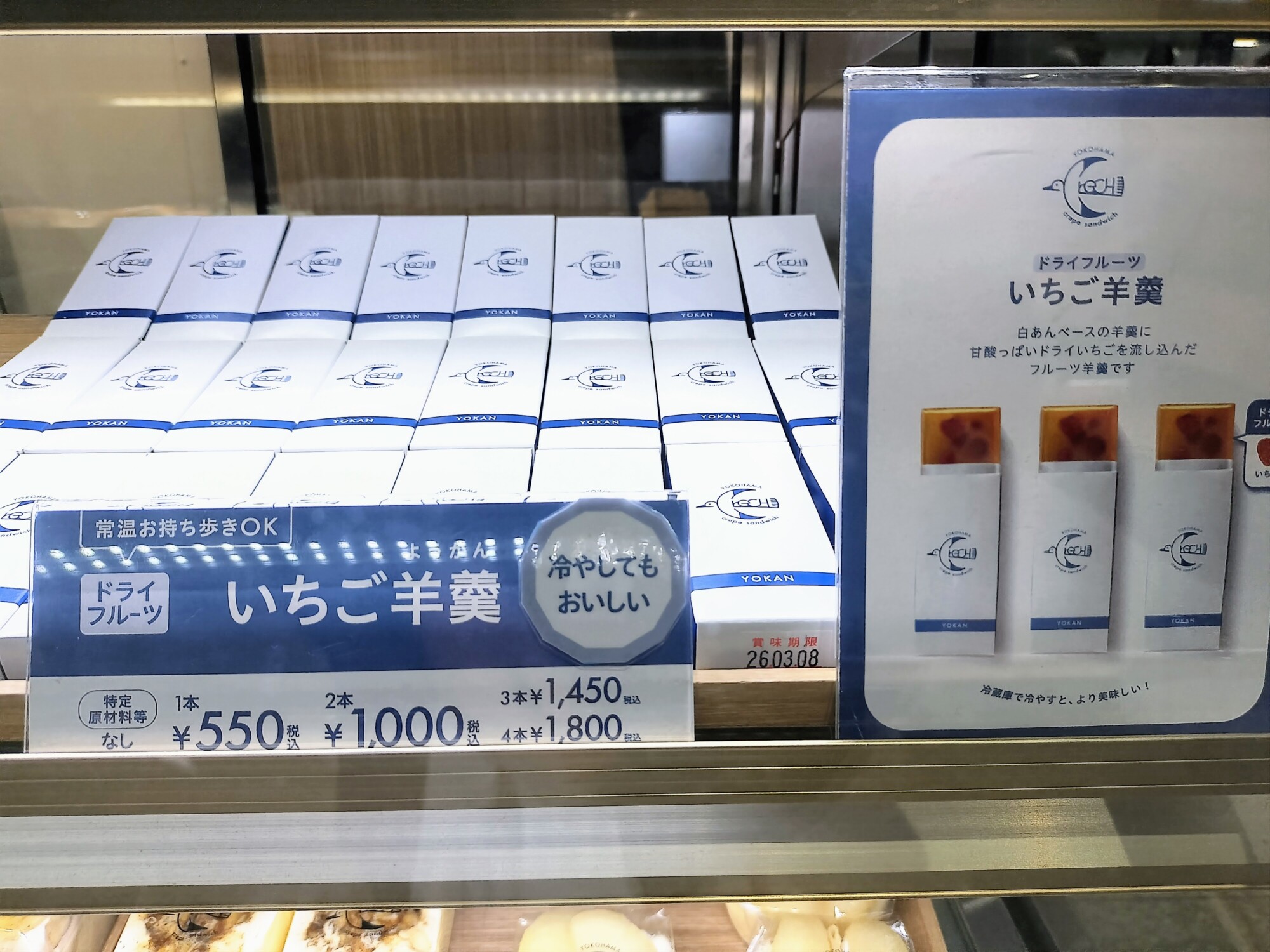 ドライいちごを使った白あんベースの「フルーツ羊羹」(550円)なども販売。