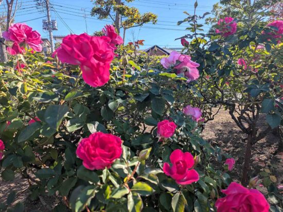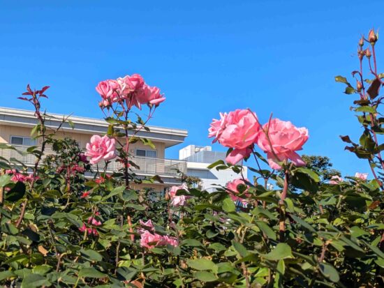 広尾防災公園のバラ。 秋晴れの青空にきれいなピンクがとっても映えていました♪