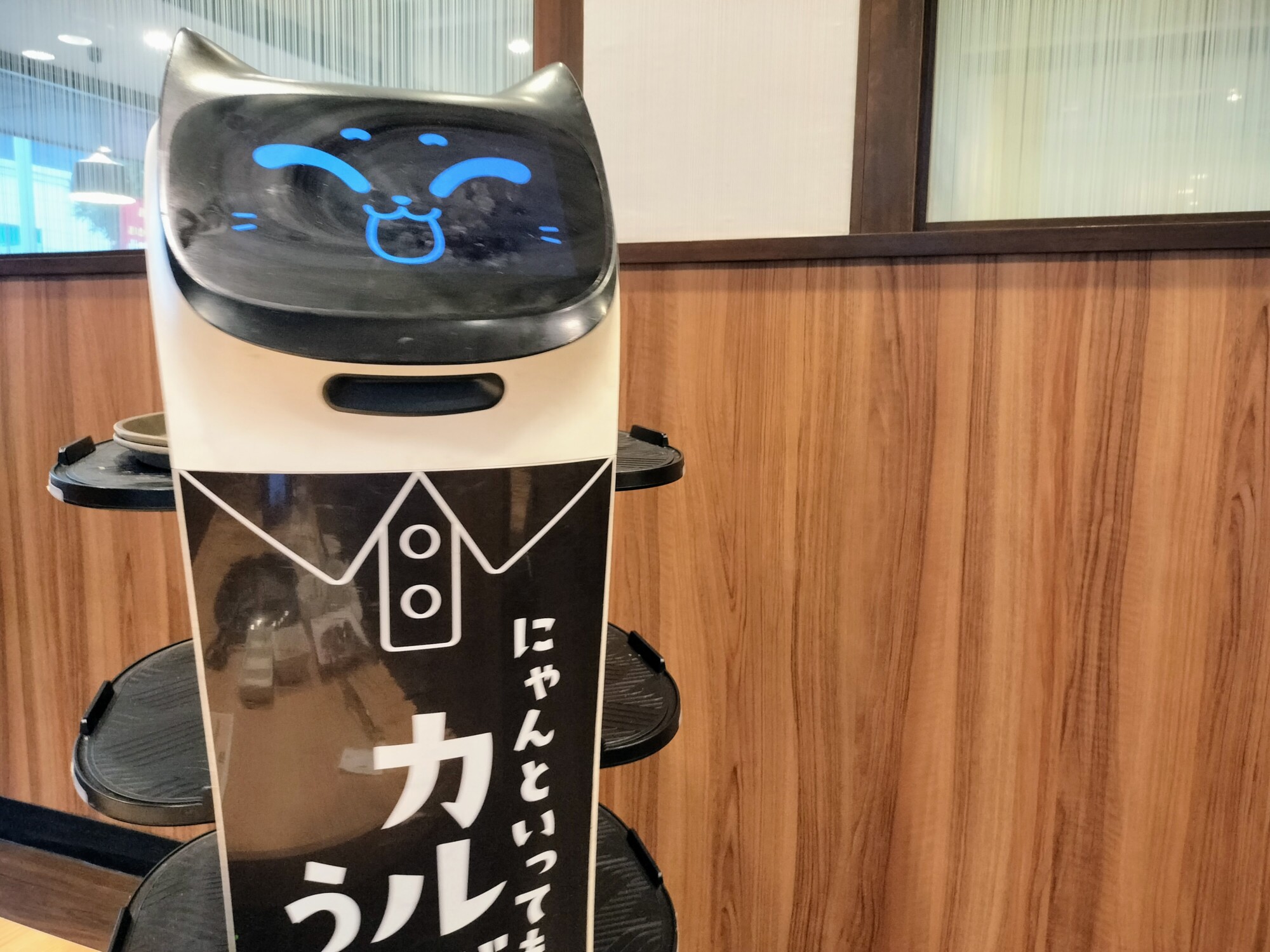 すかいらーくグループの店舗なので、あのネコ型ロボットもいる。「料理をお持ちしましたにゃーん♪」と持ってきてくれる。