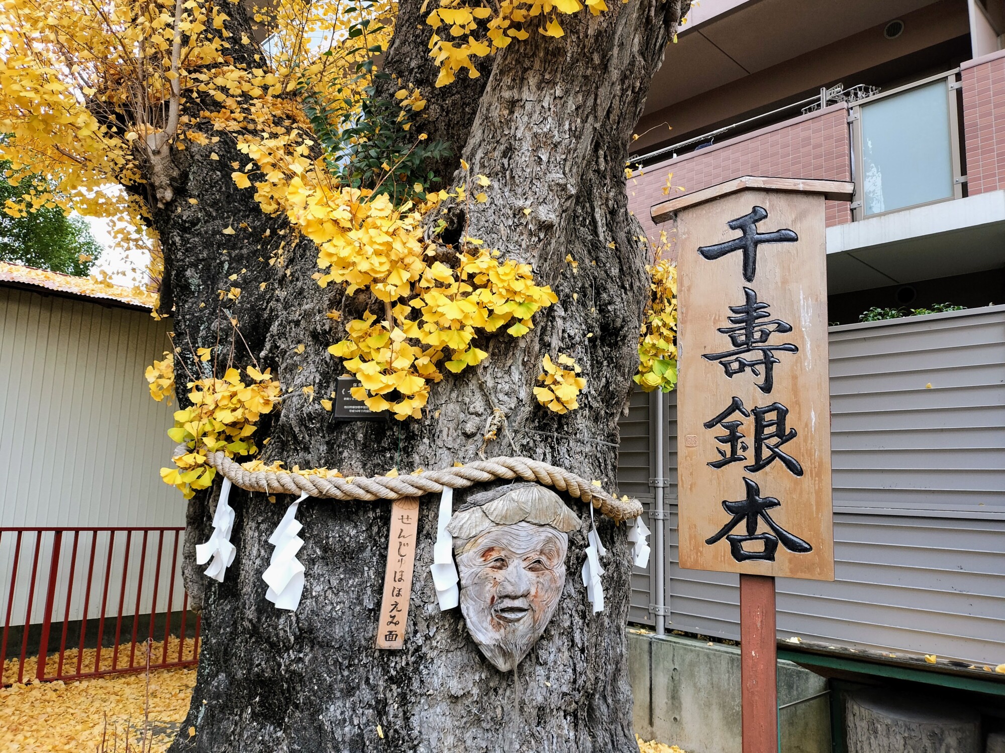 千寿銀杏の名札が立っており、イチョウの葉をモチーフにした帽子をかぶった「せんじゅほほえみ面」がある。伐採された銀杏の木から掘り出された面だそうだ。
