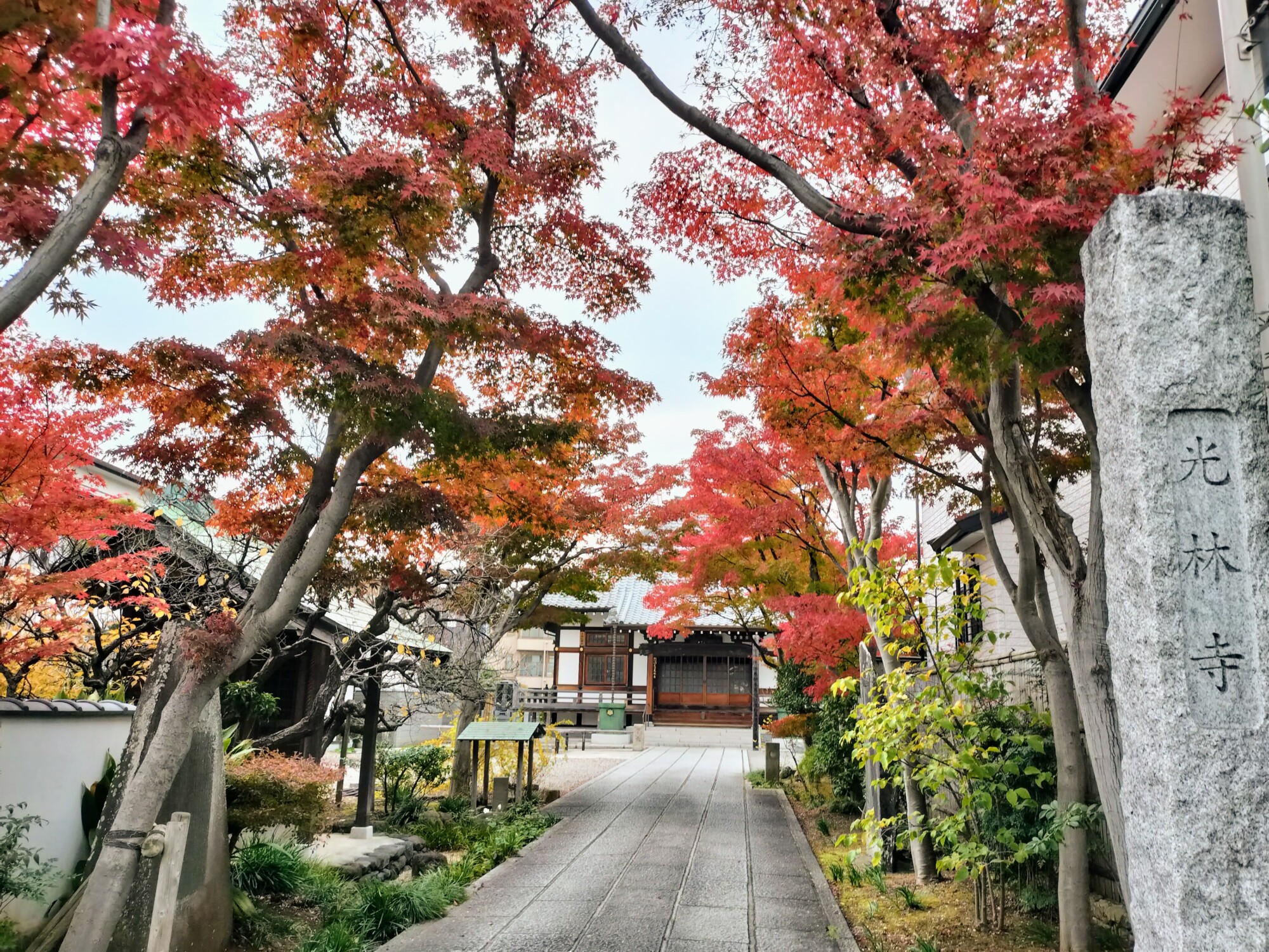 東京メトロ東西線の行徳駅から北に進み徒歩5分ほど。押切にある浄土宗来迎山 光林寺は、紅葉が赤く色づき、深まる秋を感じられる。参道の両脇に並ぶ紅葉の雅な佇まいは、まるで京都や鎌倉に訪れたような美しさだ。