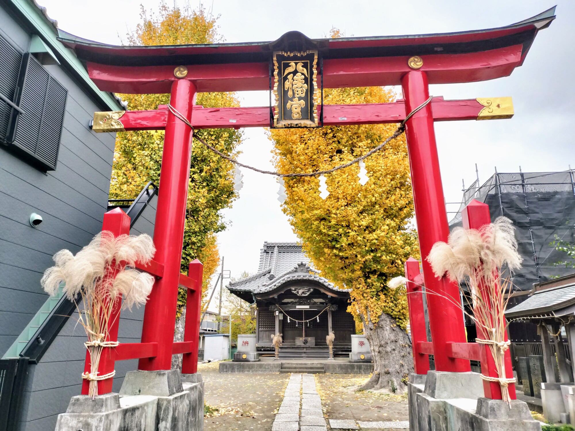 本行徳にある八幡神社は、赤い鳥居とイチョウの黄色のコントラストが美しい。鳥居にはススキの穂が飾られ、秋らしいしつらえとなっている。
