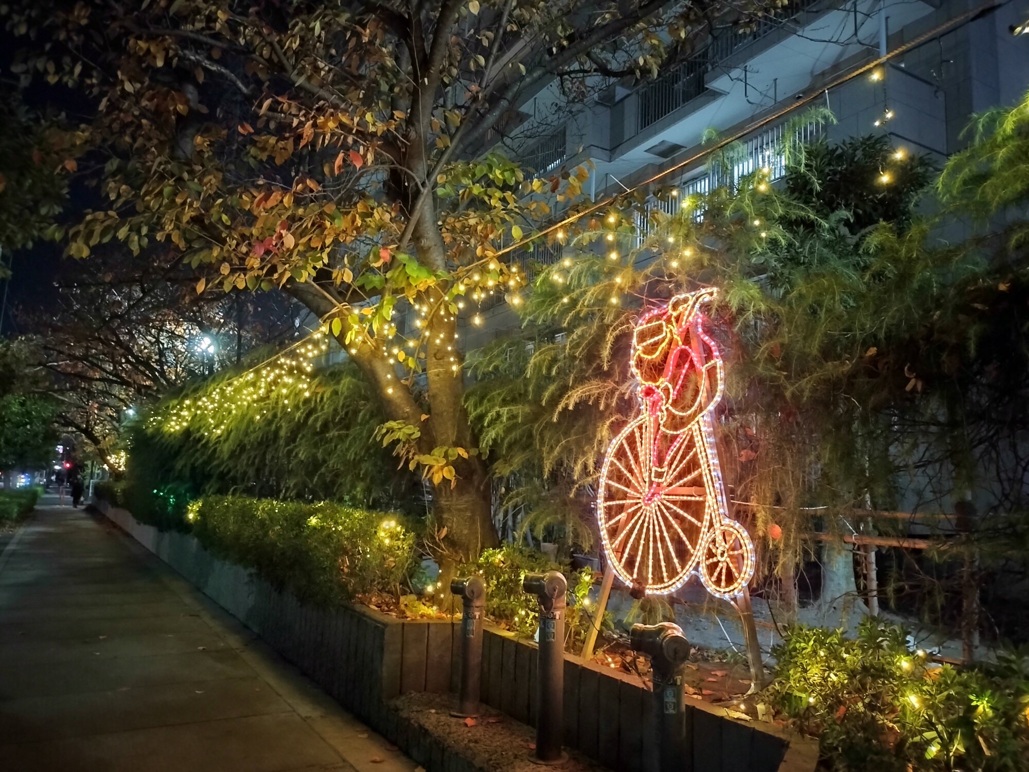 桜並木がある歩道沿いは光のシャワー。その中に自転車に乗ったサンタさんが。