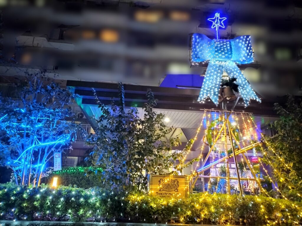 毎年行き交う人の目を引くのは、ライオンズマンション南市川自治会が行う大規模なイルミネーション。大きなブルーのリボンと光のツリーが印象的だ。