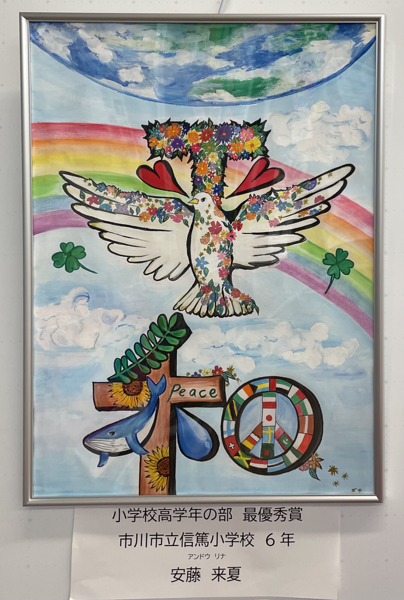 最優秀賞は、保子千結さん(富美浜小3年)、安藤来夏さん(信篤小6年)、島田このみさん(市川学園市川中3年)が受賞した。このうち安藤さんの作品は、羽を広げた白い鳩が「平」の字を、動植物と万国旗で「和」の字をかたどったデザインで、「平和への願いを込めた」という。