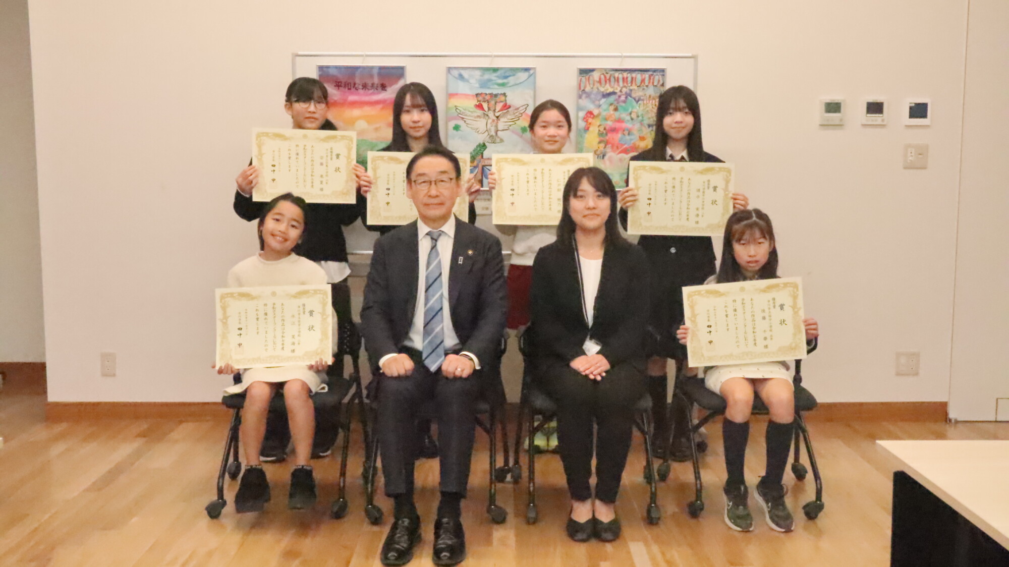 平和ポスターは平成2年度から市内小中学生を対象に毎年募集。本年度は497点の応募作の中から、最優秀賞3人、優秀賞6人、優良賞9人が選ばれた。