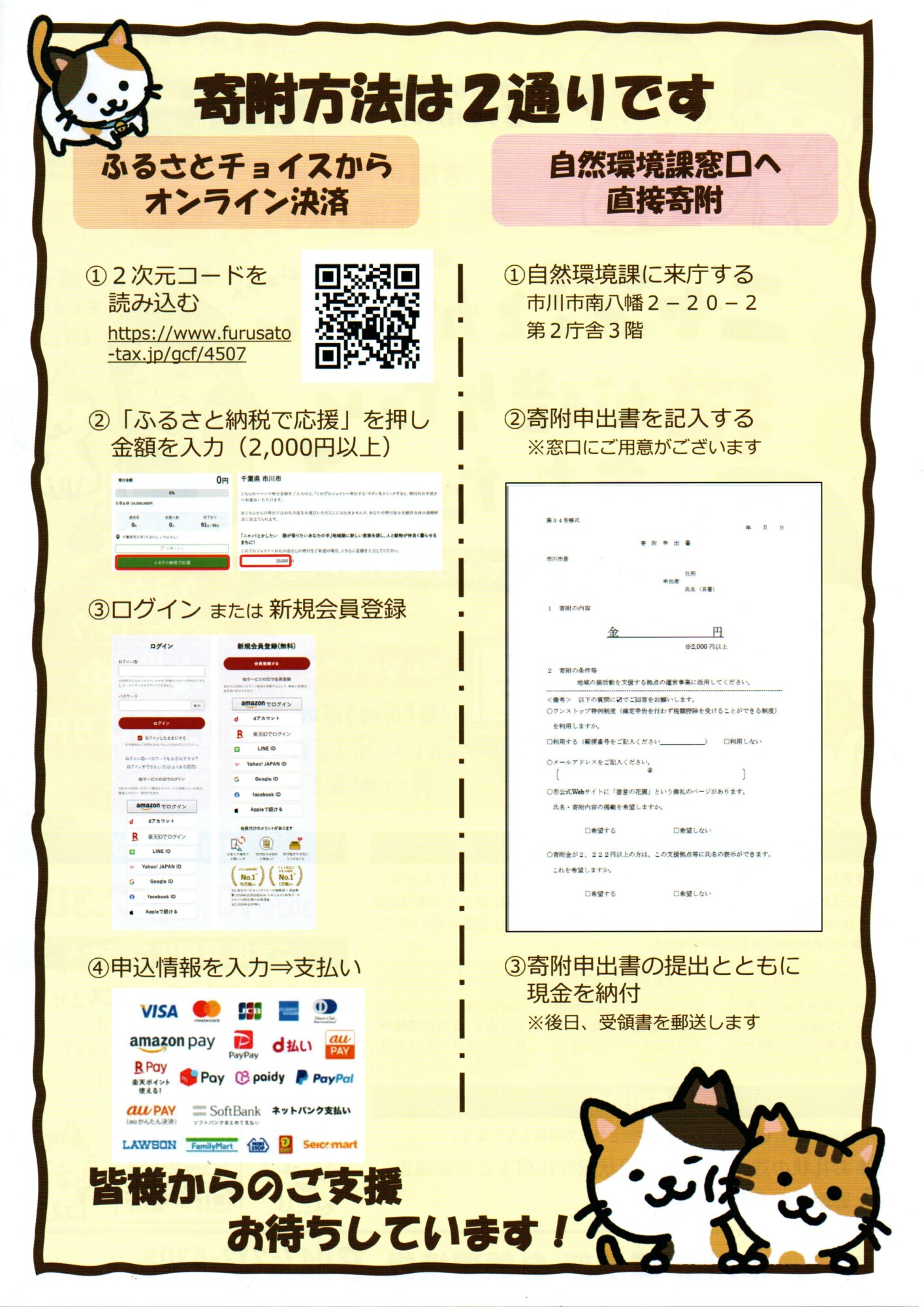 寄付の方法は、ふるさと納税寄附募集サイト『ふるさとチョイス』によるオンライン決済、または、市川市役所第2庁舎にある自然環境課窓口への直接寄附で行える。寄付は2,000円から。税控除の対象にもなる。