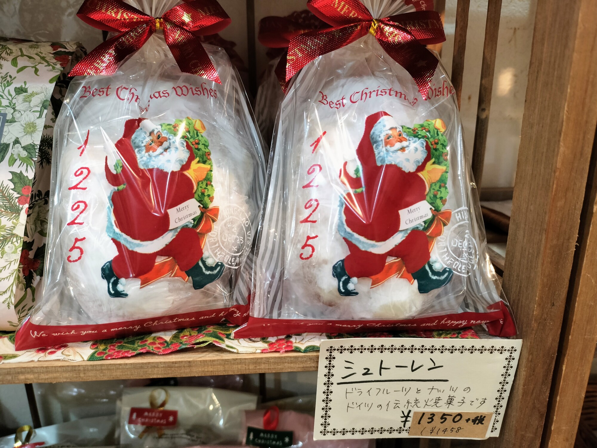 こちらはミニサイズのマンデルシュトーレン。中にはオレンジピール、パイン、レーズン、レモンピール、チェリー、フィグ、アーモンド、くるみが入っている。バターをくぐらせたうえ、砂糖でコーティングしてあるので、日持ちする。未開封なら来年1月末まで持つとか!