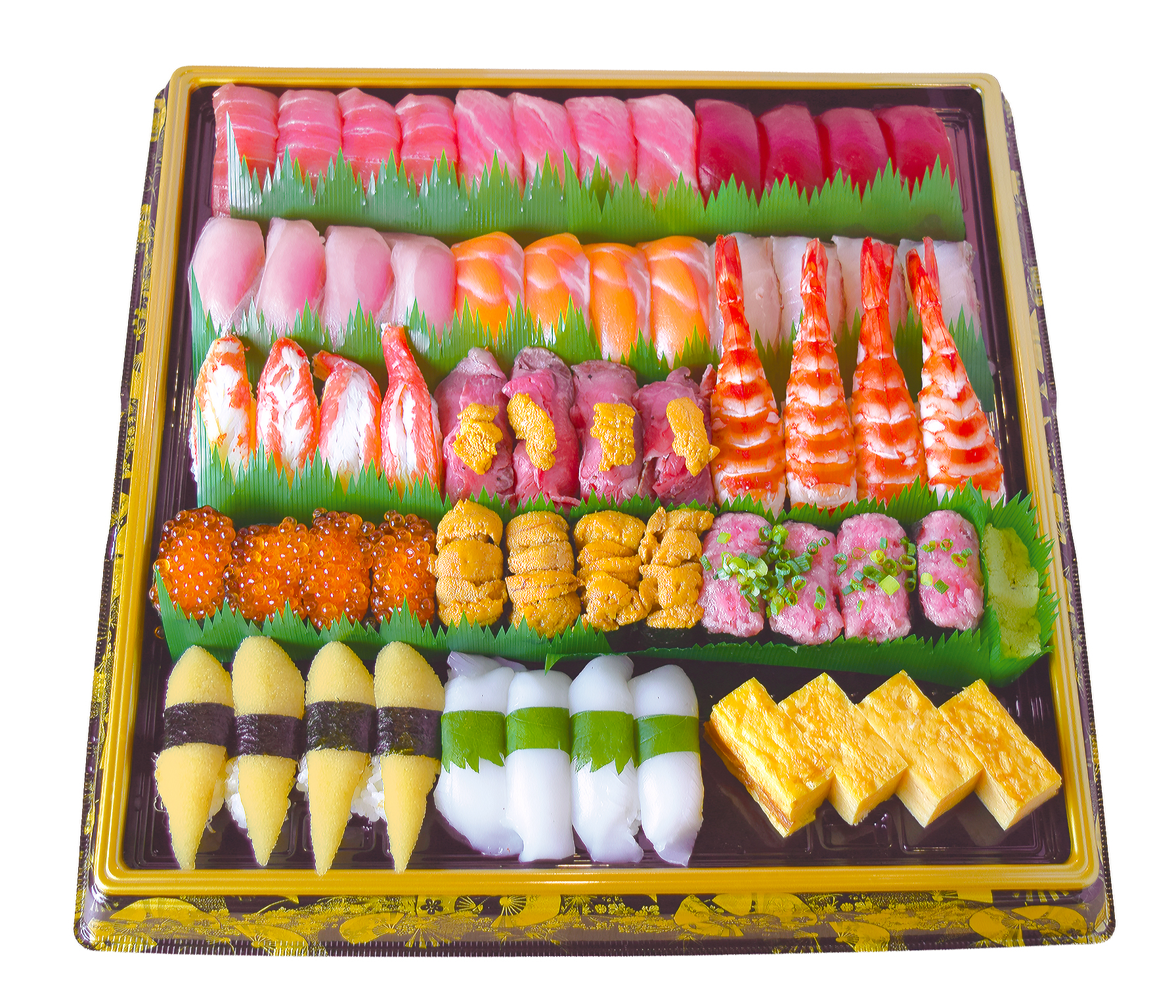 中トロ、大トロ、赤身、かんぱち、サーモン、みやび鯛、本ズワイガニ、黒毛和牛ローストビーフ、大車海老、いくら、ウニ、ネギトロ、数の子、アオリイカ、玉子、穴子一本