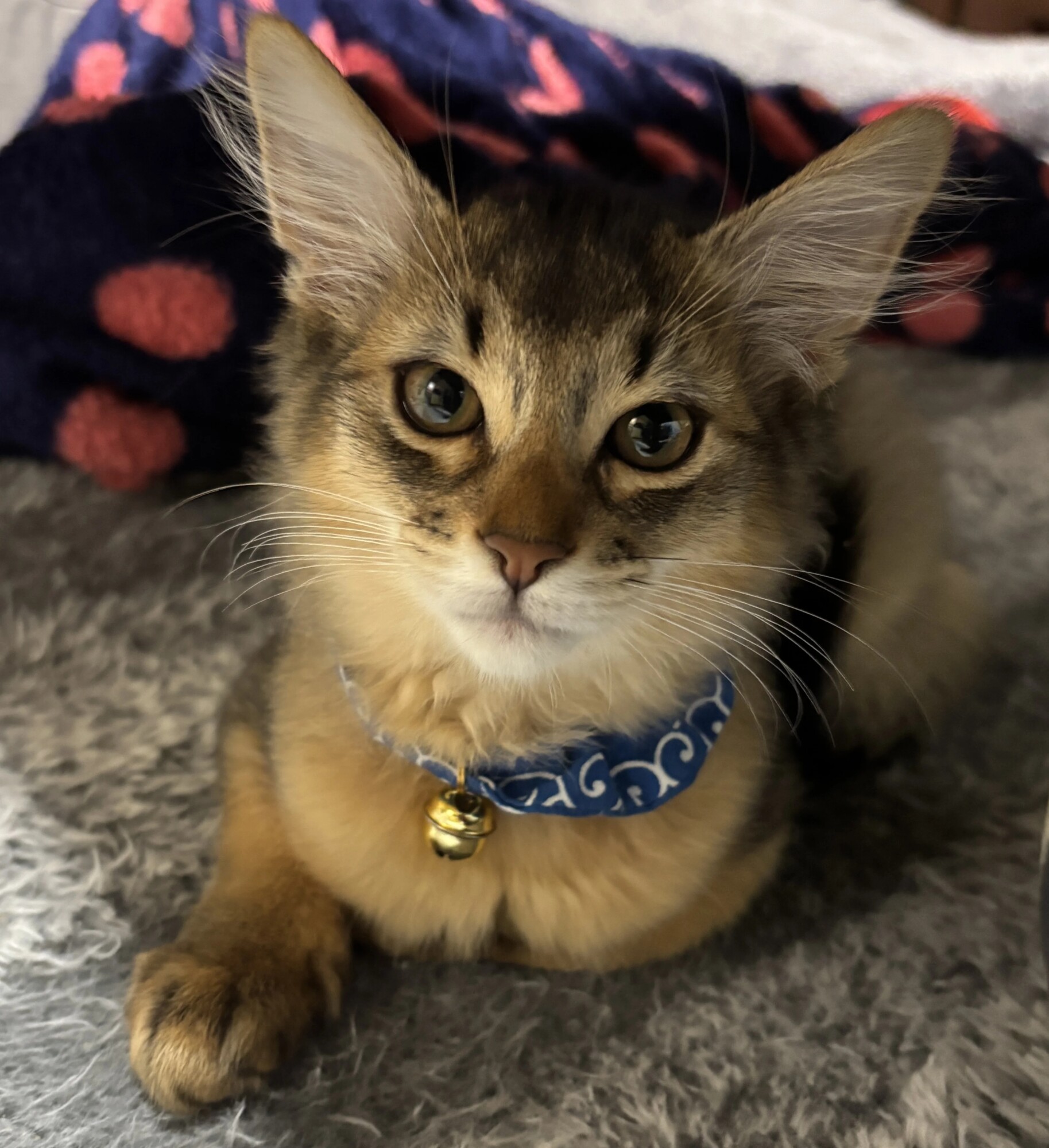 2カ月前にわが家にやってきた、現在4カ月の子猫の男の子。初めは家族にべったりの甘えん坊でしたが、今では高いところに登ってはみんなを見下ろす、すっかりやんちゃな“王様”に成長中。毎日元気いっぱいです